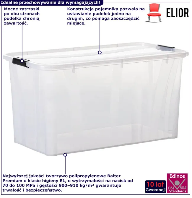 • Widoczna zawartość: Przezroczyste ścianki pozwalają na łatwą identyfikację przechowywanych przedmiotów.