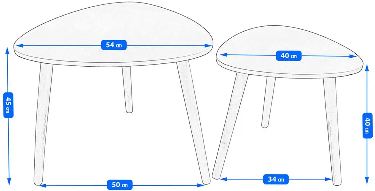 • Wysokiej jakości materiały: Blaty wykonane są z płyty MDF, która jest nie tylko estetyczna, ale także wytrzymała i łatwa do czyszczenia. Nogi stolików są wykonane z naturalnego drewna, które jest trwałe i zapewnia stabilność.