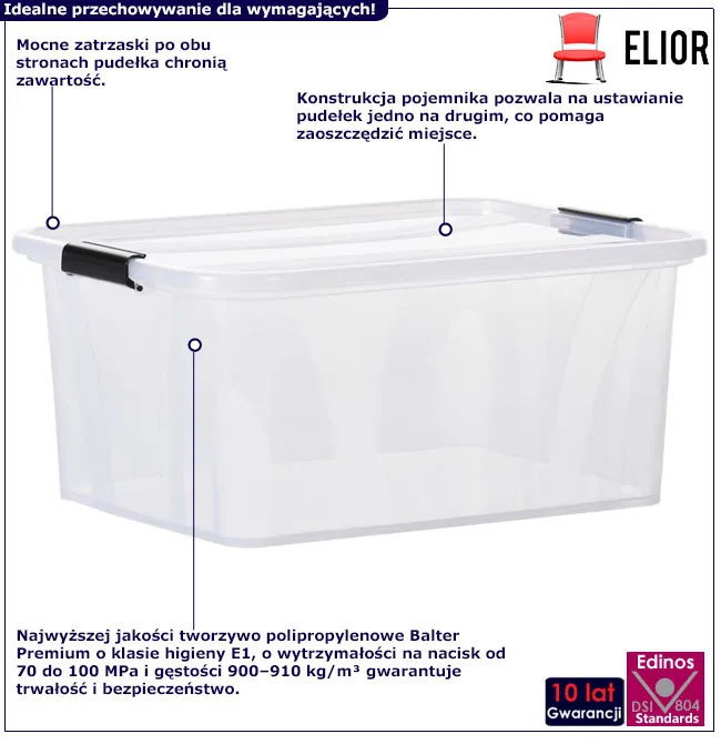 • Widoczna zawartość: Przezroczyste ścianki pozwalają na łatwą identyfikację przechowywanych przedmiotów.