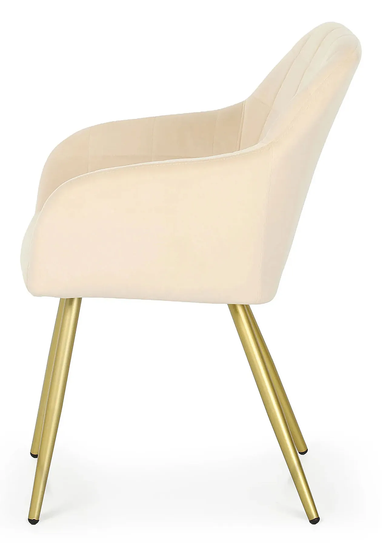Wyobraź sobie stół, przy którym wszystko jest dopracowane. Światło delikatnie odbija się od powierzchni, zastawa wygląda elegancko, a przestrzeń wokół emanuje spokojem i klasą. Właśnie w takim wnętrzu naturalnie odnajduje się zestaw 4 krzeseł Cormelis 5X. To model stworzony dla osób, które lubią, gdy detale robią tworzą design. Miękkie, harmonijne linie i subtelne pionowe przeszycia nadają bryle wyrafinowanego charakteru. Delikatnie otulające podłokietniki sprawiają, że forma wygląda lekko, a jednocześnie daje poczucie komfortu i stabilności. Materiał obiciowy jest przyjemny w dotyku i trwały, dzięki czemu krzesła zachowują swój estetyczny wygląd nawet przy intensywnym, codziennym użytkowaniu. Zestaw 4 sztuk pozwala stworzyć spójną, elegancką aranżację przy stole - bez przypadkowości. Smukłe złote nogi dodają wizualnej lekkości, a stabilna konstrukcja gwarantuje pewność użytkowania. Cormelis 5X doskonale wpisuje się w aranżacje modern classic, glamour, quiet luxury oraz nowoczesne przestrzenie o stonowanym charakterze. To nie jest tylko zestaw krzeseł. To element, który sprawia, że całe wnętrze zaczyna wyglądać bardziej świadomie zaprojektowane.