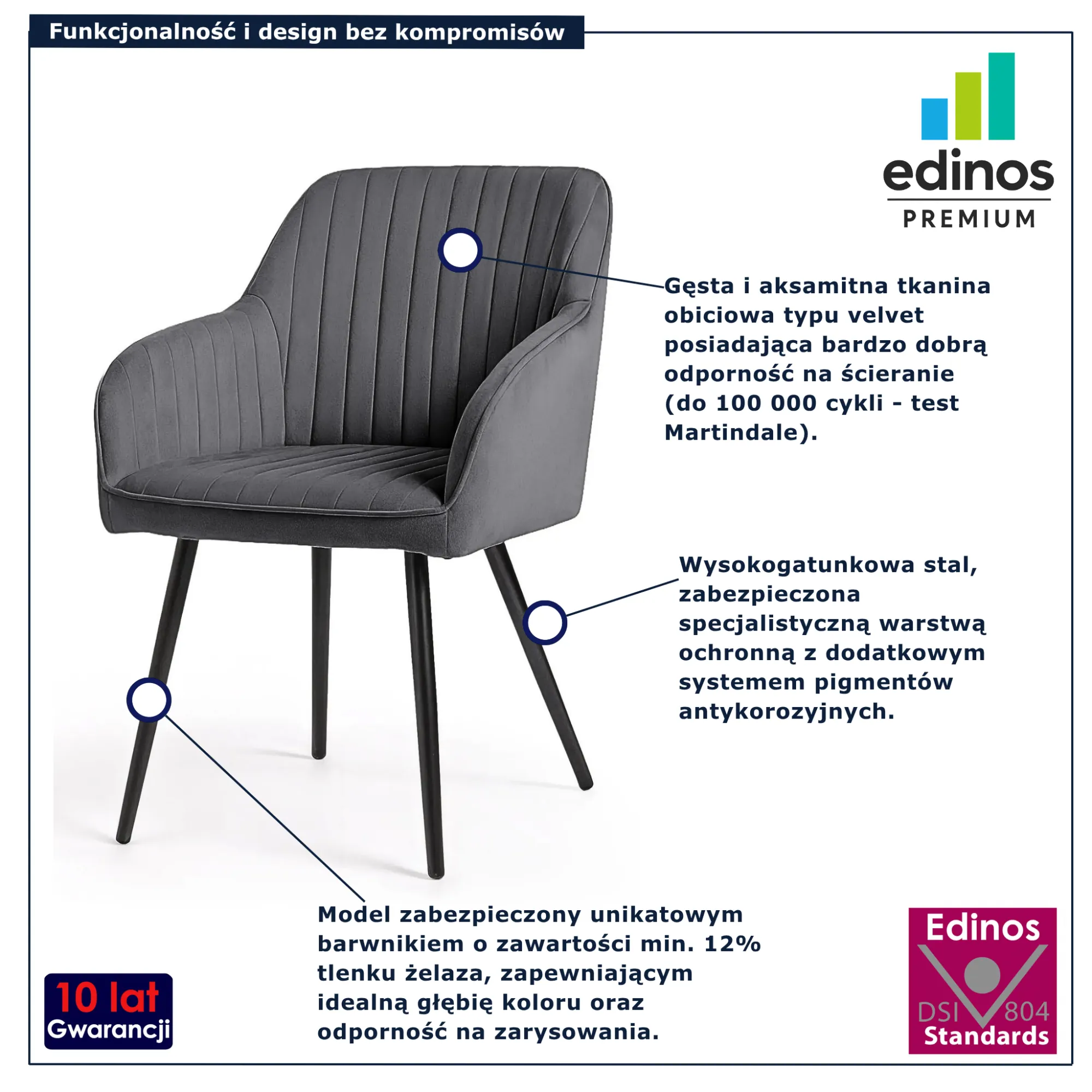 • Produkt posiada certyfikat jakości "Edinos Standards DSI 804", który potwierdza najwyższą jakość wykonania mebla oraz pełny stopień zgodności poszczególnych jednostek wytworzonego wyrobu z przyjętym wzorcem.