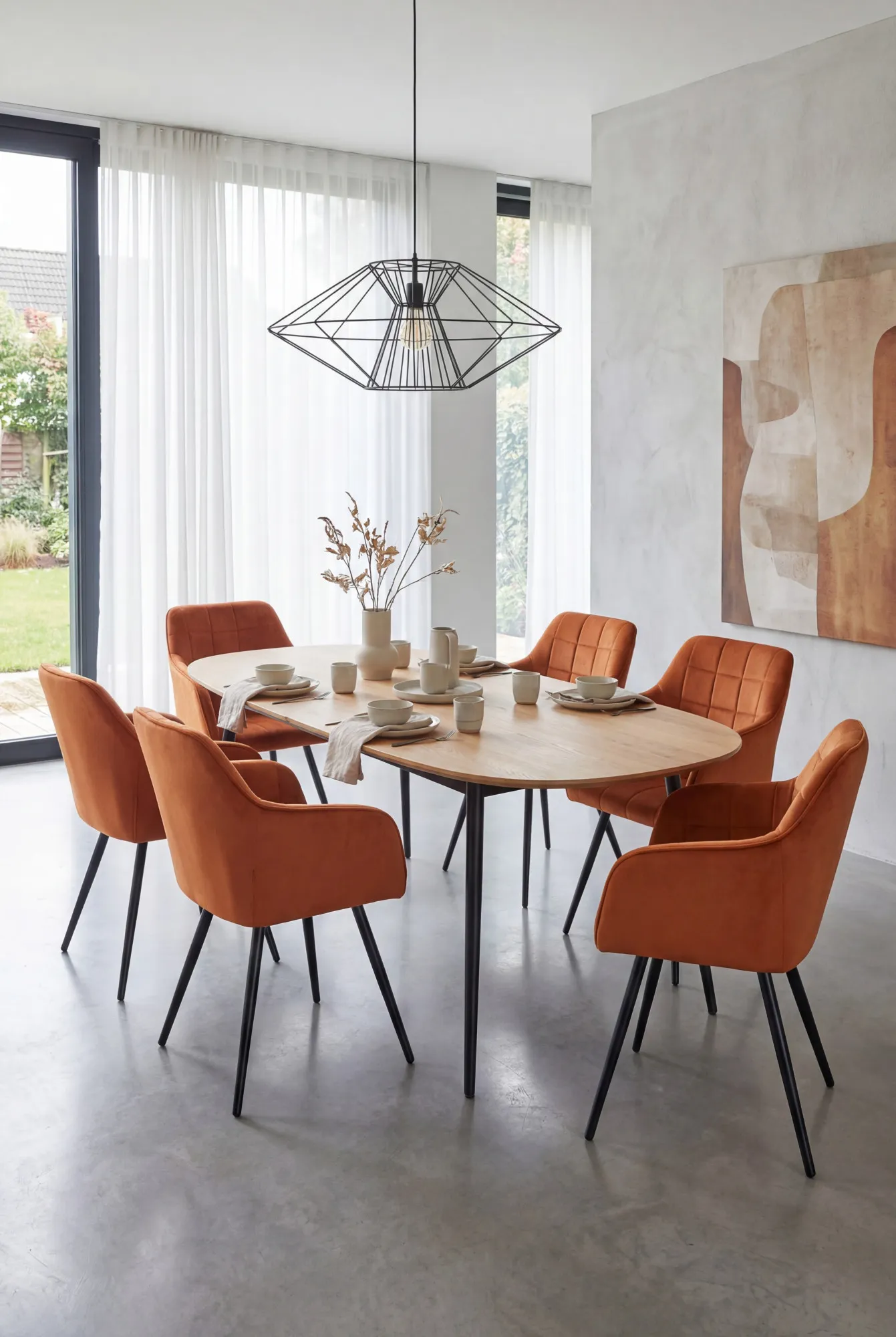 Aranżacja jadalni z pomarańczowymi krzesłami Cormelis 4X