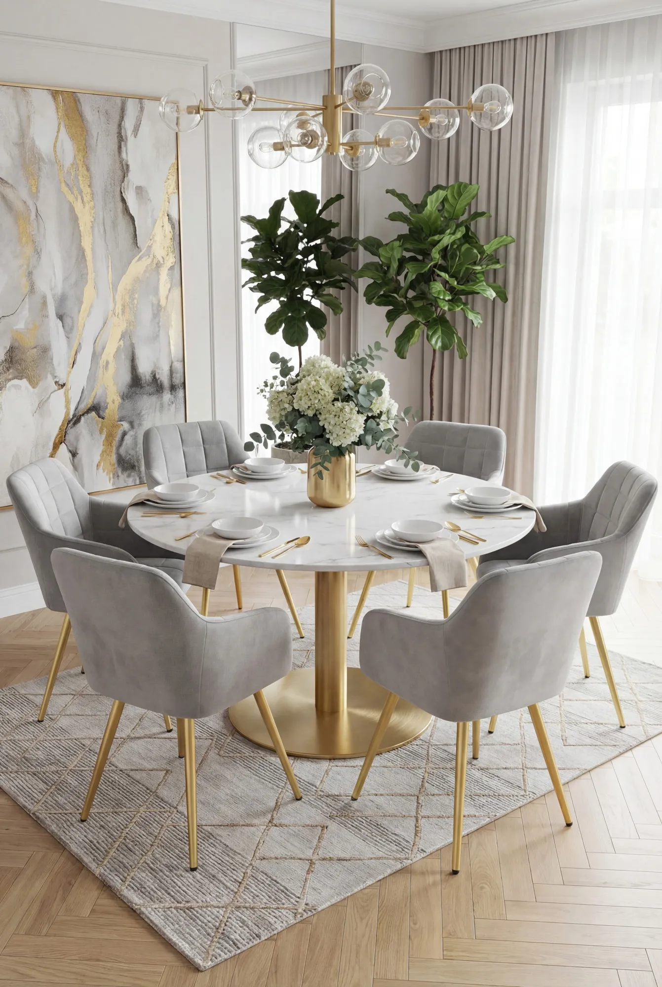 Wyobraź sobie stół, przy którym wszystko jest dopracowane. Światło delikatnie odbija się od powierzchni, zastawa wygląda elegancko, a przestrzeń wokół emanuje spokojem i klasą. Właśnie w takim wnętrzu naturalnie odnajduje się zestaw 4 krzeseł Cormelis 5X. To model stworzony dla osób, które lubią, gdy detale robią tworzą design. Miękkie, harmonijne linie i subtelne pionowe przeszycia nadają bryle wyrafinowanego charakteru. Delikatnie otulające podłokietniki sprawiają, że forma wygląda lekko, a jednocześnie daje poczucie komfortu i stabilności. Materiał obiciowy jest przyjemny w dotyku i trwały, dzięki czemu krzesła zachowują swój estetyczny wygląd nawet przy intensywnym, codziennym użytkowaniu. Zestaw 4 sztuk pozwala stworzyć spójną, elegancką aranżację przy stole - bez przypadkowości. Smukłe złote nogi dodają wizualnej lekkości, a stabilna konstrukcja gwarantuje pewność użytkowania. Cormelis 5X doskonale wpisuje się w aranżacje modern classic, glamour, quiet luxury oraz nowoczesne przestrzenie o stonowanym charakterze. To nie jest tylko zestaw krzeseł. To element, który sprawia, że całe wnętrze zaczyna wyglądać bardziej świadomie zaprojektowane.