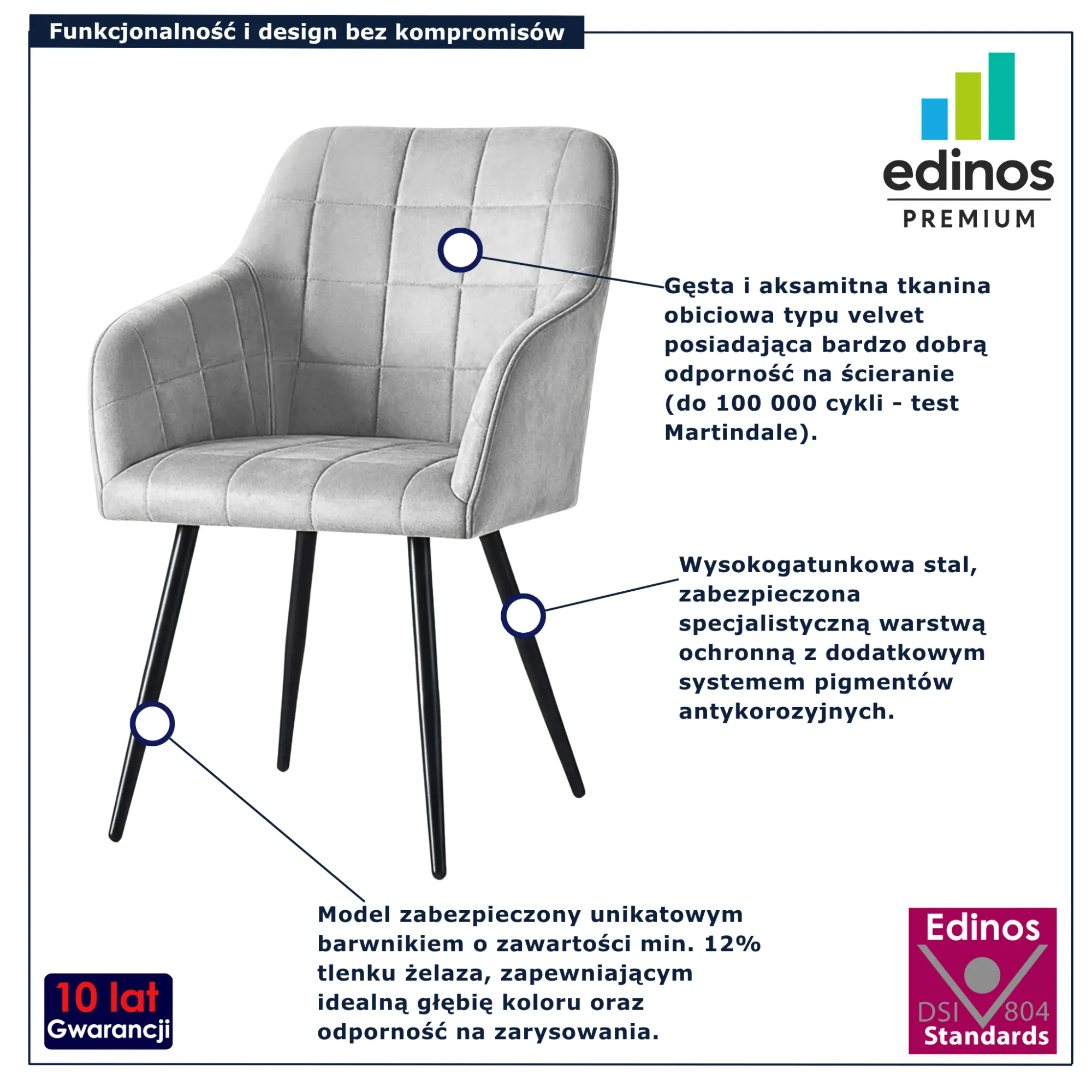 • Produkt posiada certyfikat jakości "Edinos Standards DSI 804", który potwierdza najwyższą jakość wykonania mebla oraz pełny stopień zgodności poszczególnych jednostek wytworzonego wyrobu z przyjętym wzorcem.