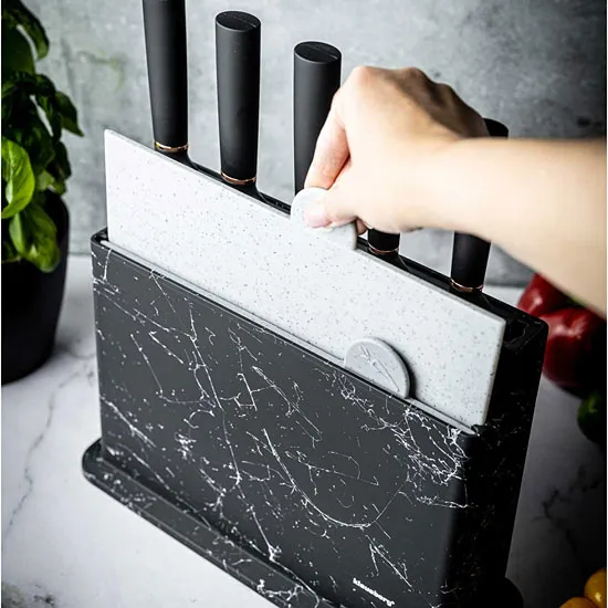 Twoje kulinarne marzenia nabiorą nowego blasku z zestawem noży kuchennych Ibero 6X. Ten nowoczesny i pełen glamour zestaw wprowadzi do Twojej kuchni powiew elegancji i funkcjonalności. Każdy nóż został zaprojektowany tak, by harmonizować z Twoją estetyką, jednocześnie zapewniając niezrównaną precyzję w krojeniu. Odkryj, jak luksus i praktyczność mogą stworzyć idealną kombinację w Twojej codziennej kuchennej rutynie. Noże te wyróżniają się niezwykłą ostrością i trwałością ostrzy, dzięki zaawansowanej technologii produkcji w wysokich temperaturach. Ich ergonomiczne, antypoślizgowe uchwyty zapewniają wygodę i bezpieczeństwo podczas krojenia. Wykonane ze stali nierdzewnej z powłoką nieprzywierającą, nie pozostawiają metalicznego posmaku na żywności. Powierzchnia noży jest antybakteryjna i odporna na plamy, dzięki czemu zachowują higieniczny wygląd. Całość prezentuje się niezwykle stylowo, nawiązując wyglądem do czarnego marmuru. To must-have dla każdej kuchni, łączące funkcjonalność z estetyką.