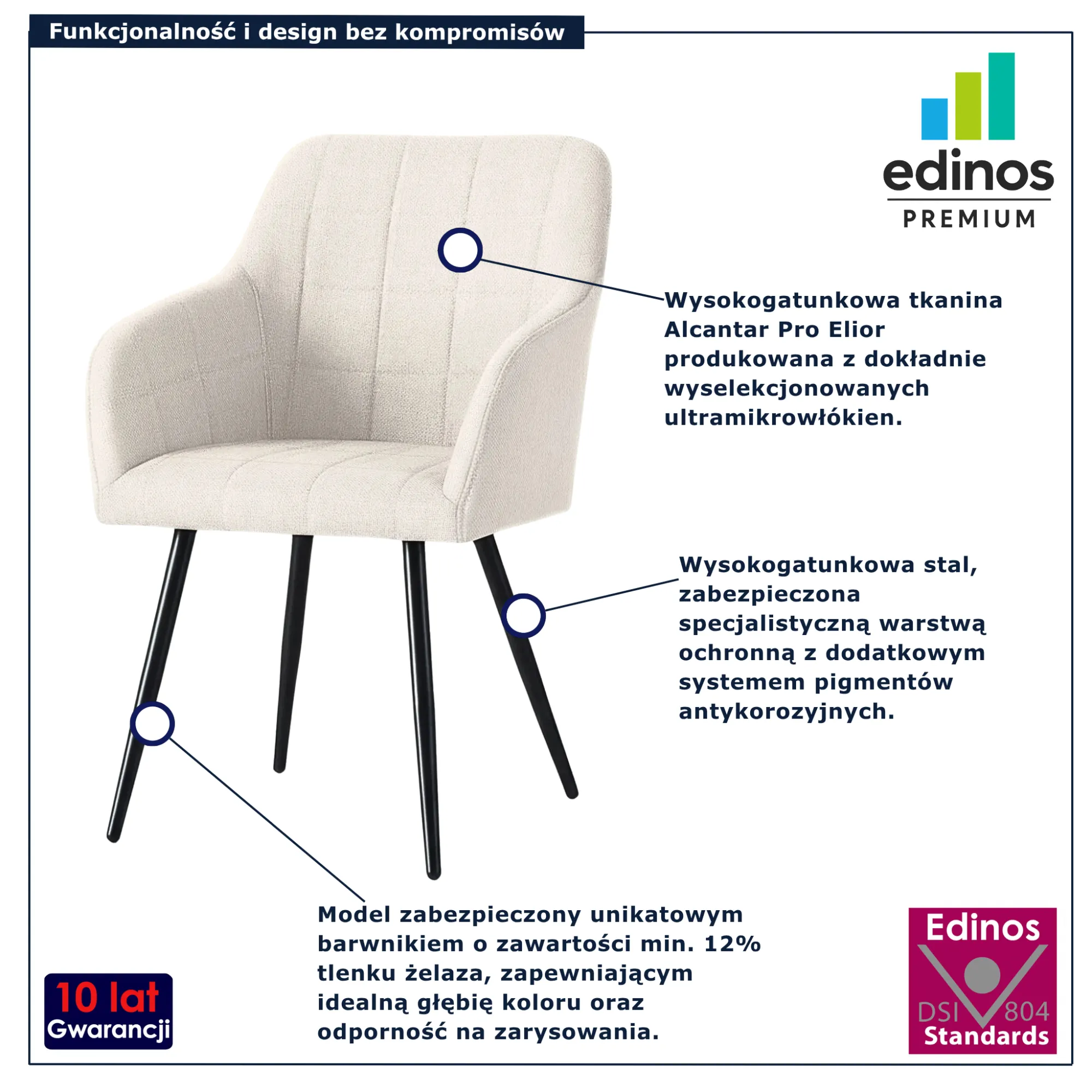 • Produkt posiada certyfikat jakości "Edinos Standards DSI 804", który potwierdza najwyższą jakość wykonania mebla oraz pełny stopień zgodności poszczególnych jednostek wytworzonego wyrobu z przyjętym wzorcem.