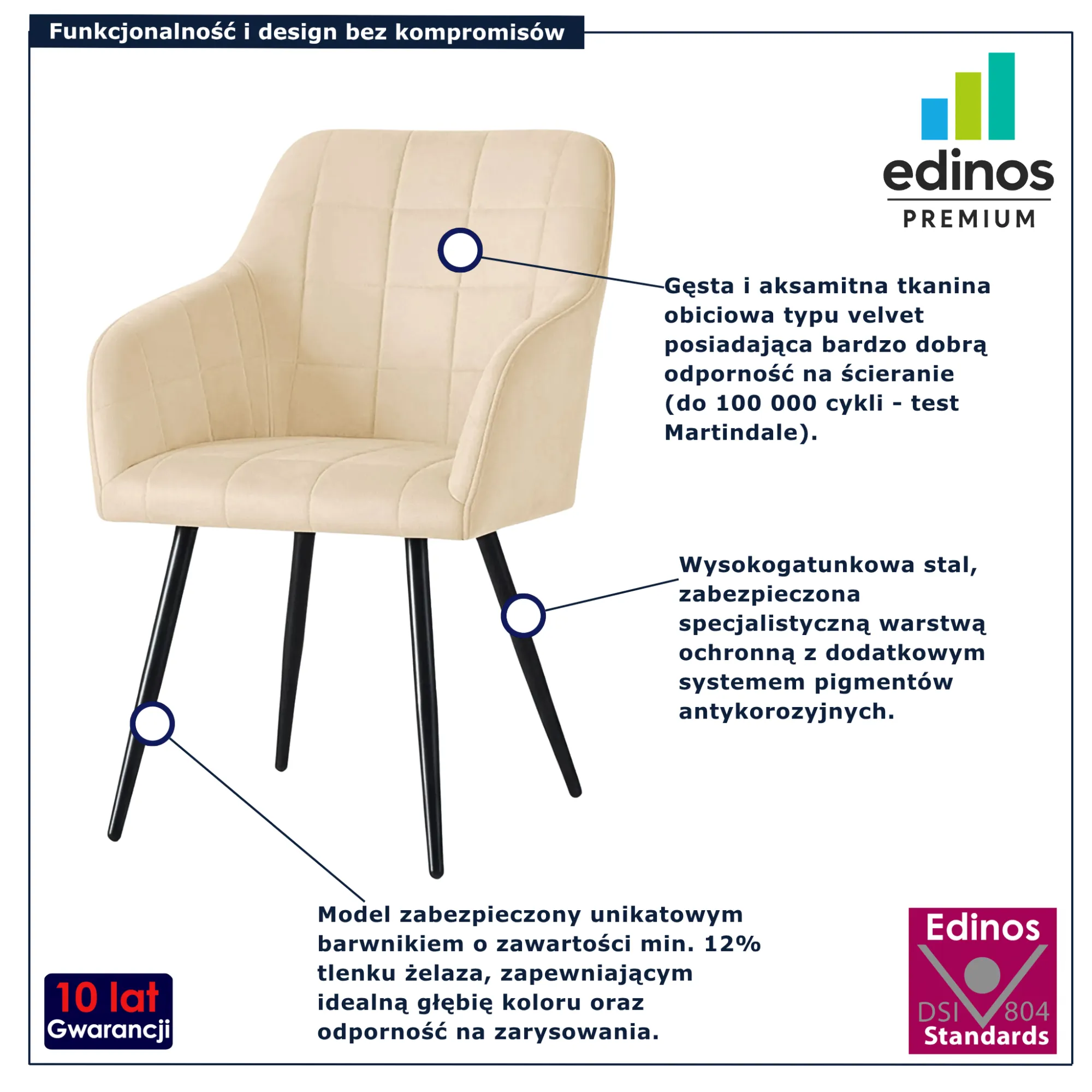 • Produkt posiada certyfikat jakości "Edinos Standards DSI 804", który potwierdza najwyższą jakość wykonania mebla oraz pełny stopień zgodności poszczególnych jednostek wytworzonego wyrobu z przyjętym wzorcem.