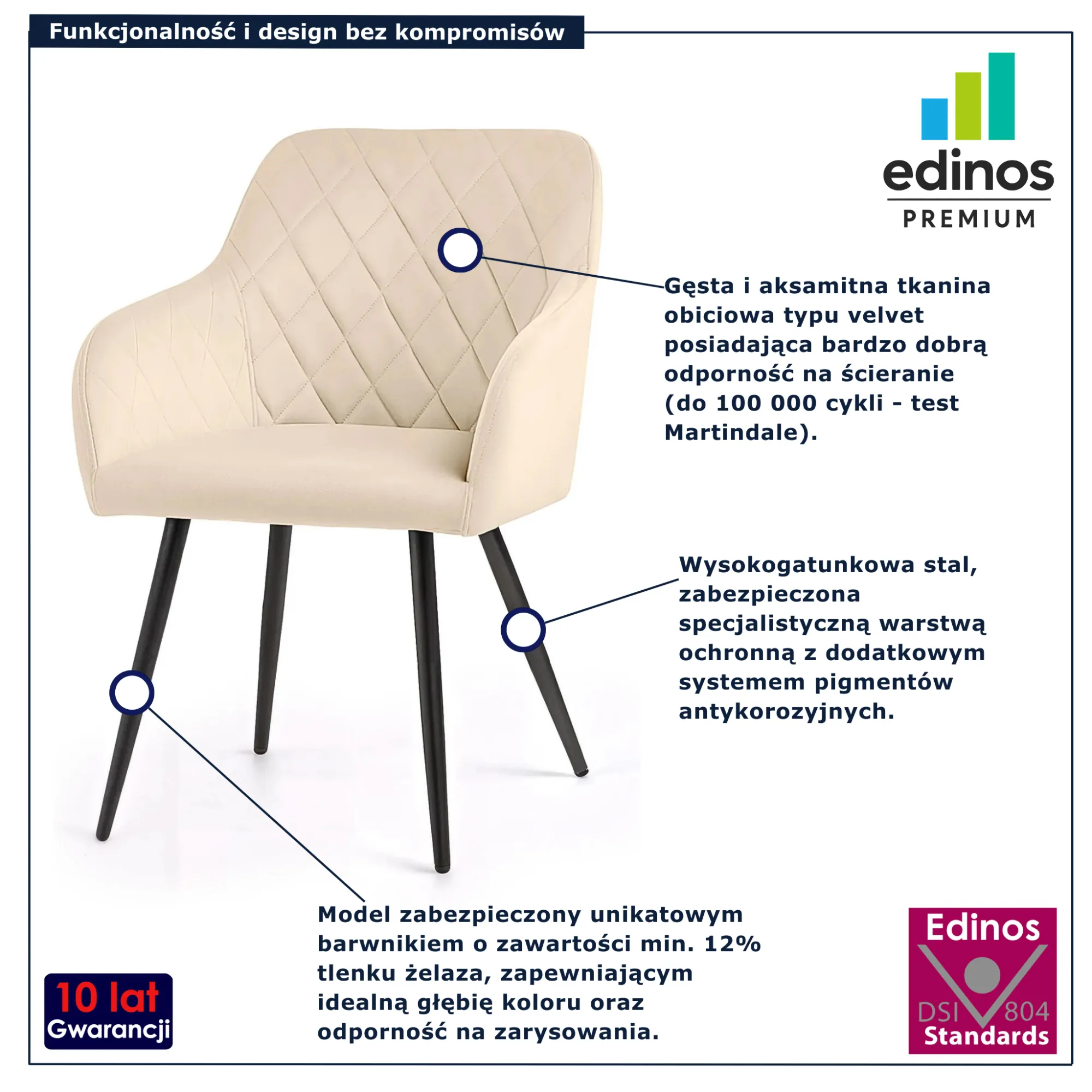 • Produkt posiada certyfikat jakości "Edinos Standards DSI 804", który potwierdza najwyższą jakość wykonania mebla oraz pełny stopień zgodności poszczególnych jednostek wytworzonego wyrobu z przyjętym wzorcem.