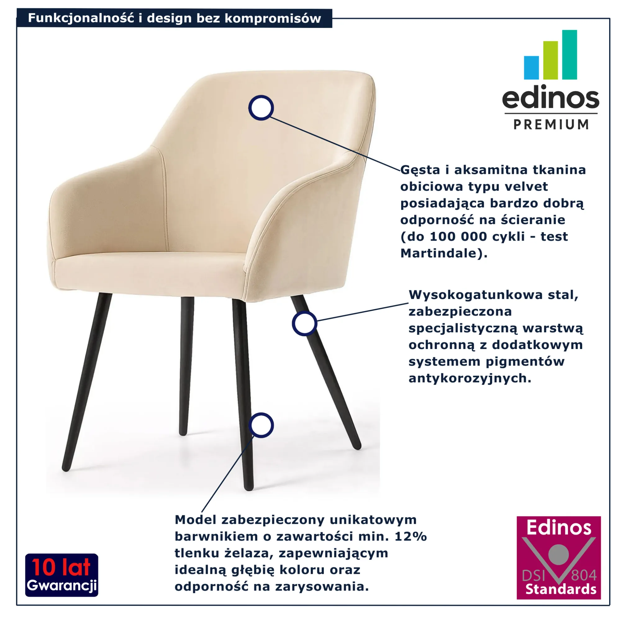 • Produkt posiada certyfikat jakości "Edinos Standards DSI 804", który potwierdza najwyższą jakość wykonania mebla oraz pełny stopień zgodności poszczególnych jednostek wytworzonego wyrobu z przyjętym wzorcem.