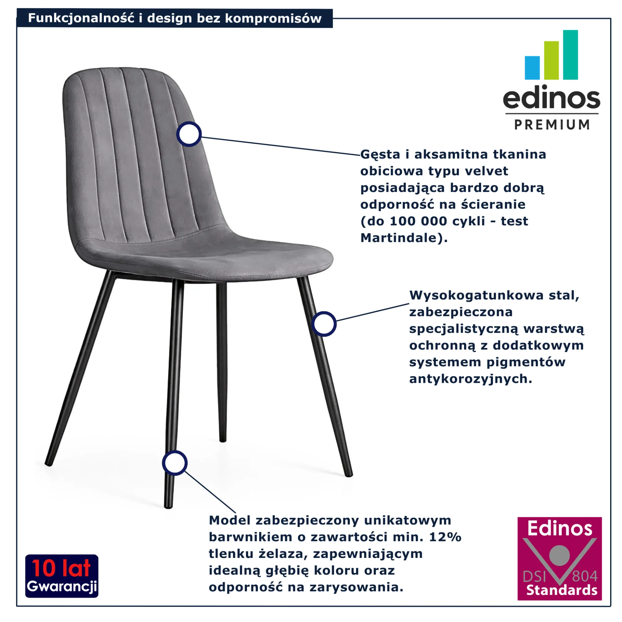 • Produkt posiada certyfikat jakości "Edinos Standards DSI 804", który potwierdza najwyższą jakość wykonania mebla oraz pełny stopień zgodności poszczególnych jednostek wytworzonego wyrobu z przyjętym wzorcem.