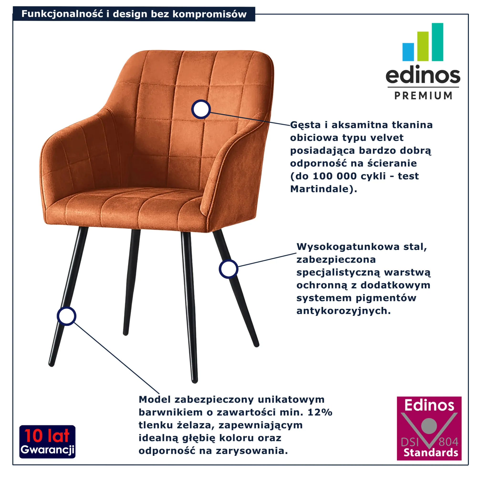 • Produkt posiada certyfikat jakości "Edinos Standards DSI 804", który potwierdza najwyższą jakość wykonania mebla oraz pełny stopień zgodności poszczególnych jednostek wytworzonego wyrobu z przyjętym wzorcem.