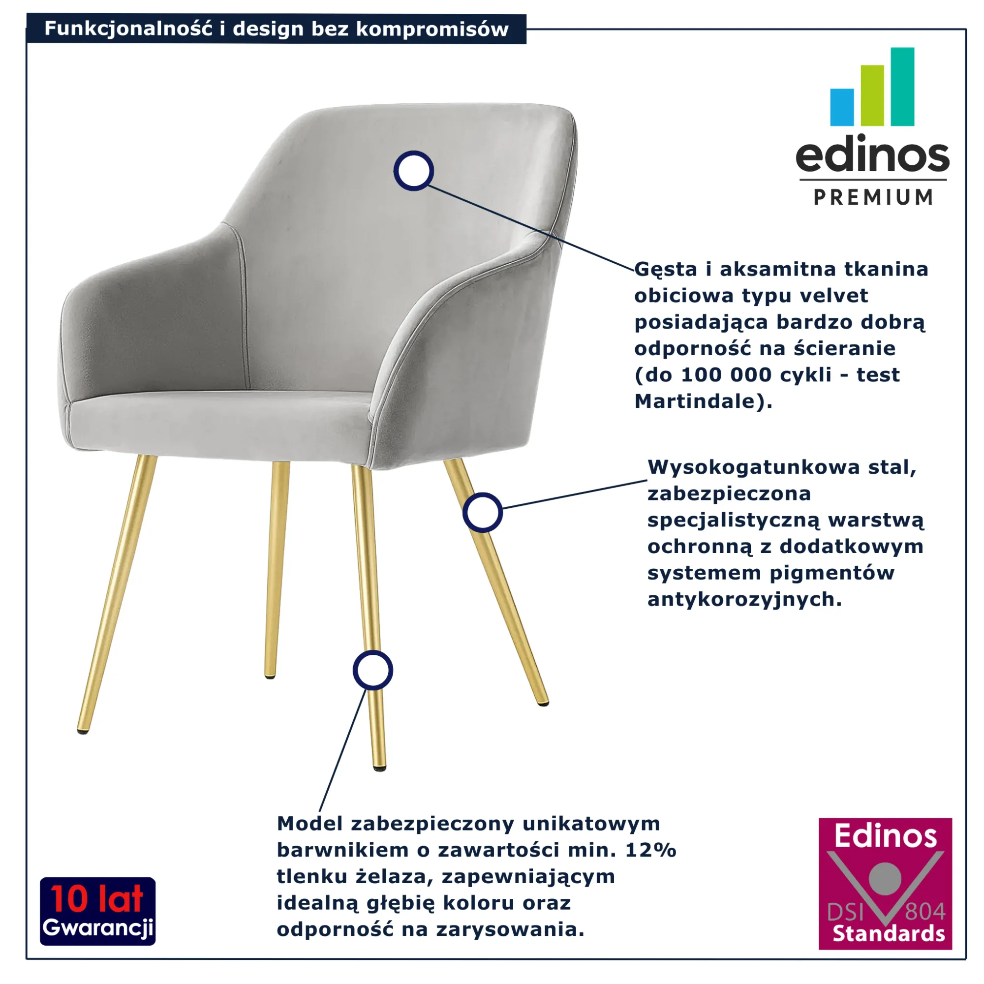 • Produkt posiada certyfikat jakości "Edinos Standards DSI 804", który potwierdza najwyższą jakość wykonania mebla oraz pełny stopień zgodności poszczególnych jednostek wytworzonego wyrobu z przyjętym wzorcem.