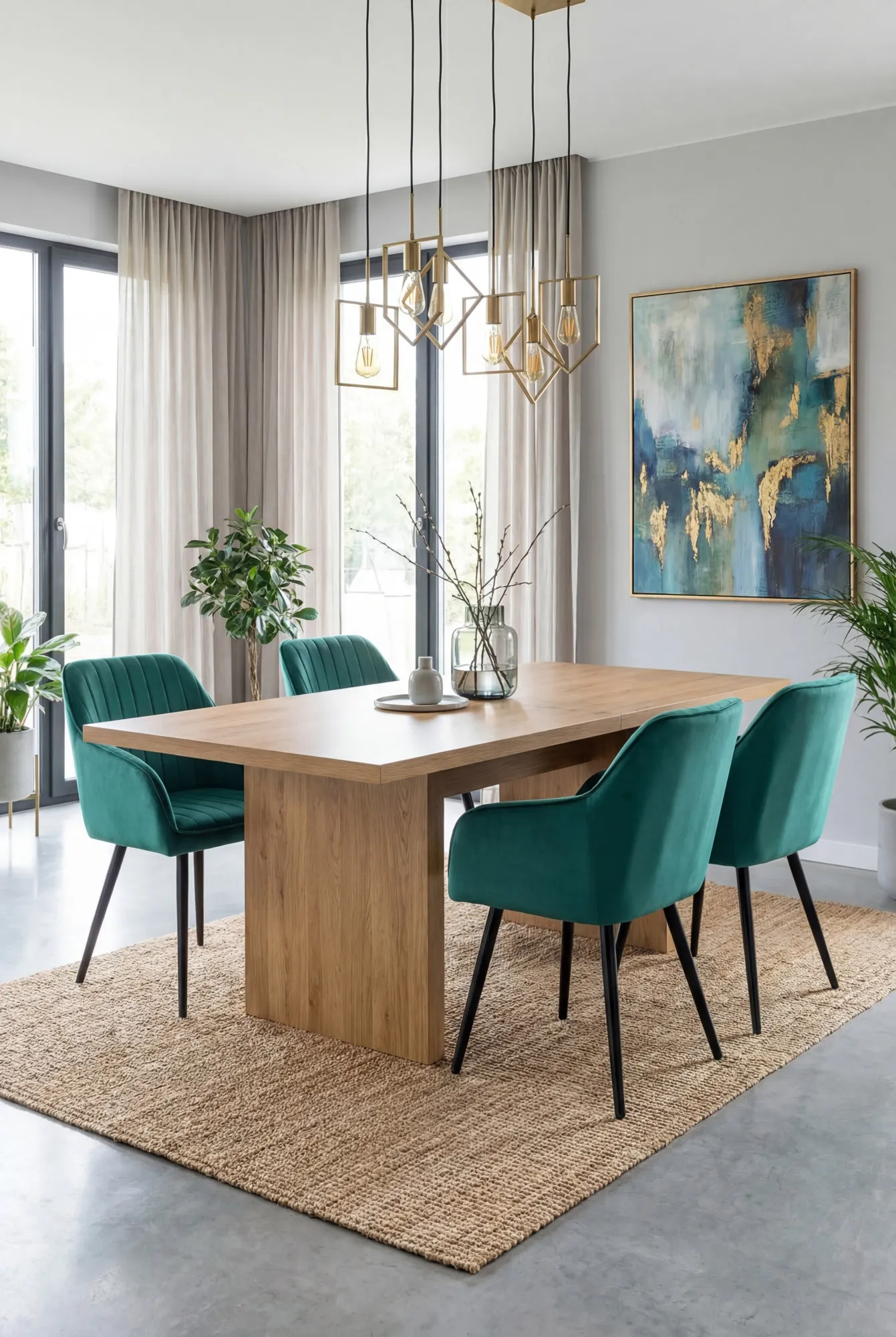 Aranżacja jadalni z zielonymi krzesłami Sorvello