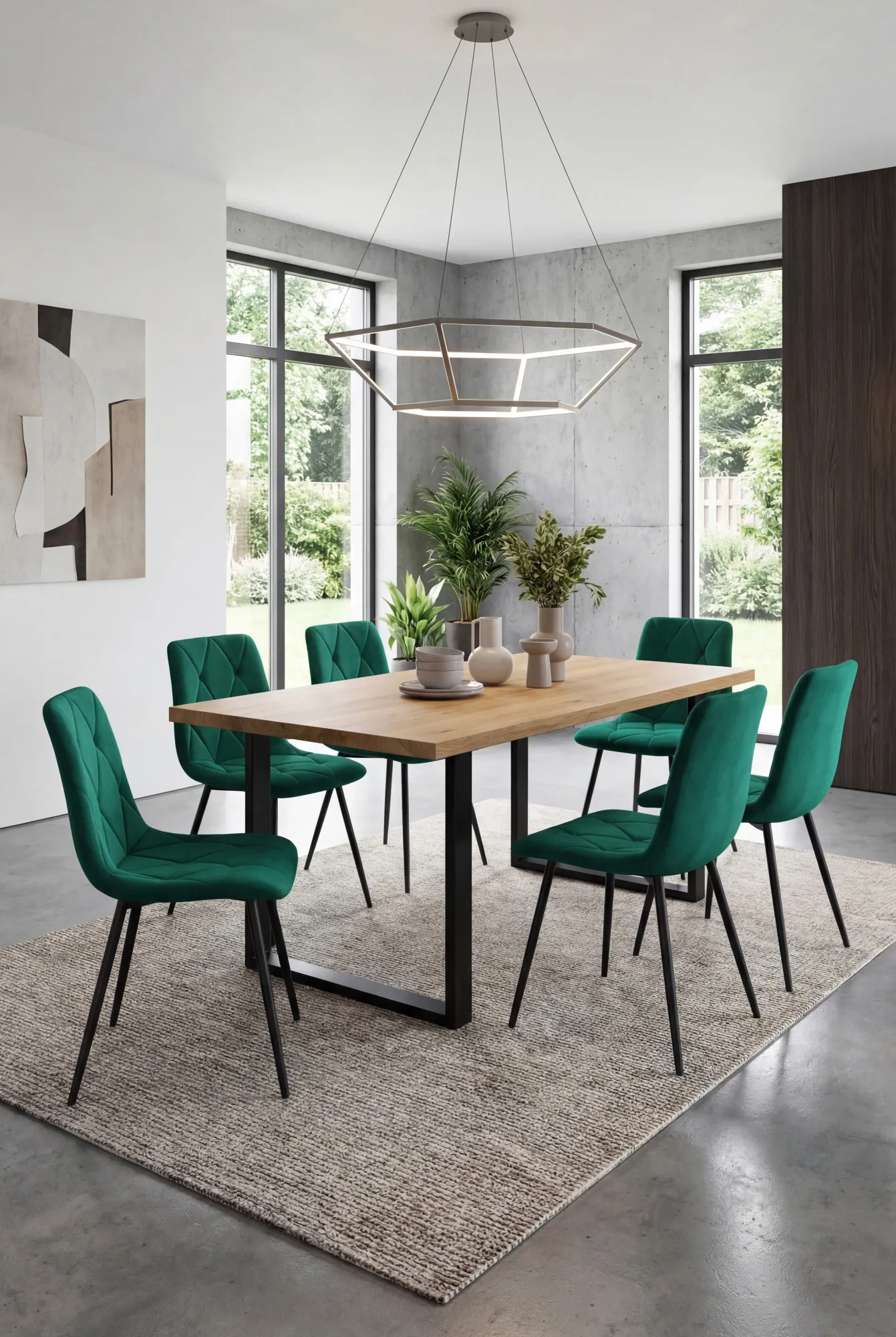 Aranżacja jadalni z zielonymi krzesłami Lumario