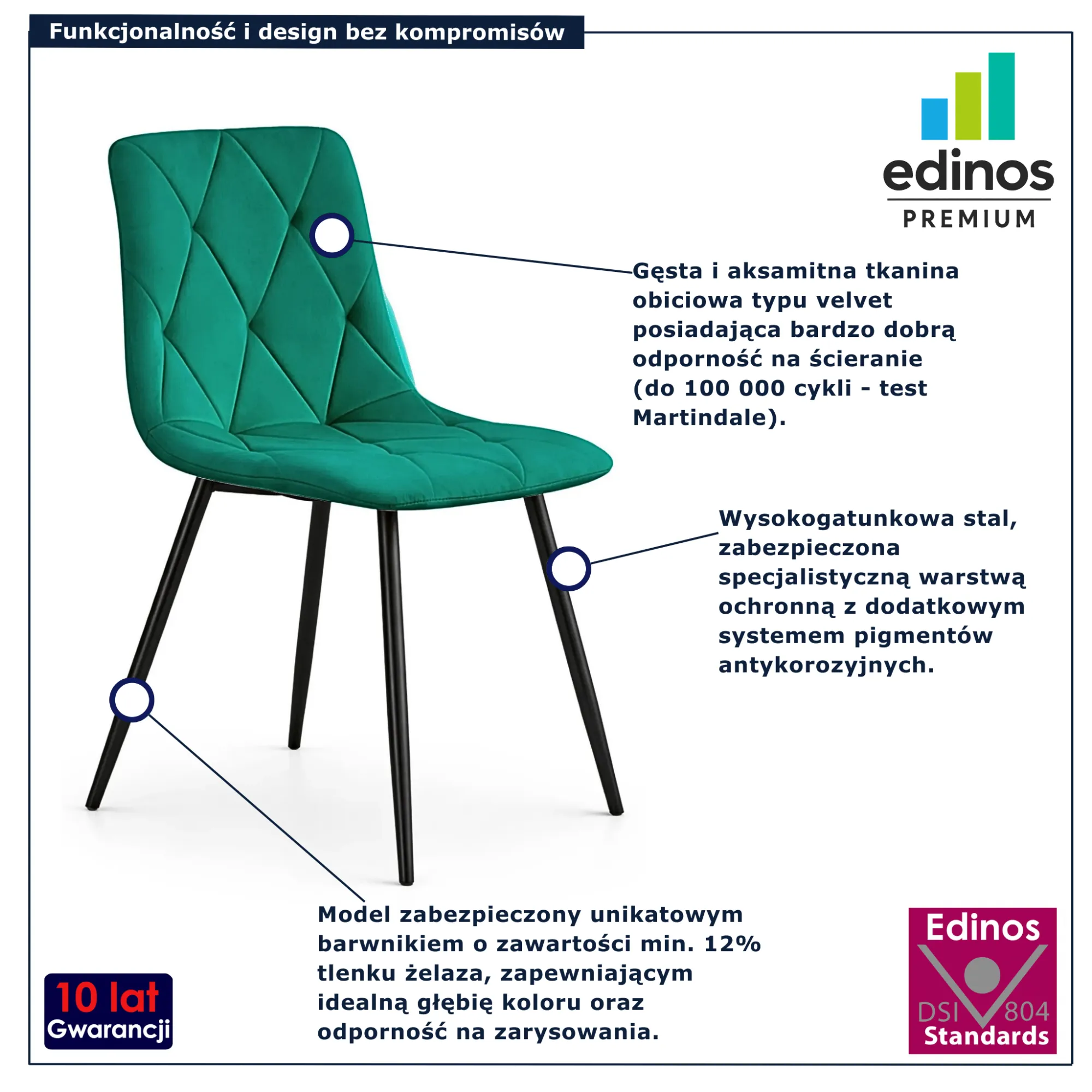 • Produkt posiada certyfikat jakości "Edinos Standards DSI 804", który potwierdza najwyższą jakość wykonania mebla oraz pełny stopień zgodności poszczególnych jednostek wytworzonego wyrobu z przyjętym wzorcem.