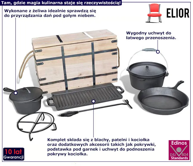• ​w skład zestawu wchodzi: blacha, patelnia, kociołek, pokrywki, podstawka pod garnek i uchwyt do podnoszenia pokrywy kociołka.