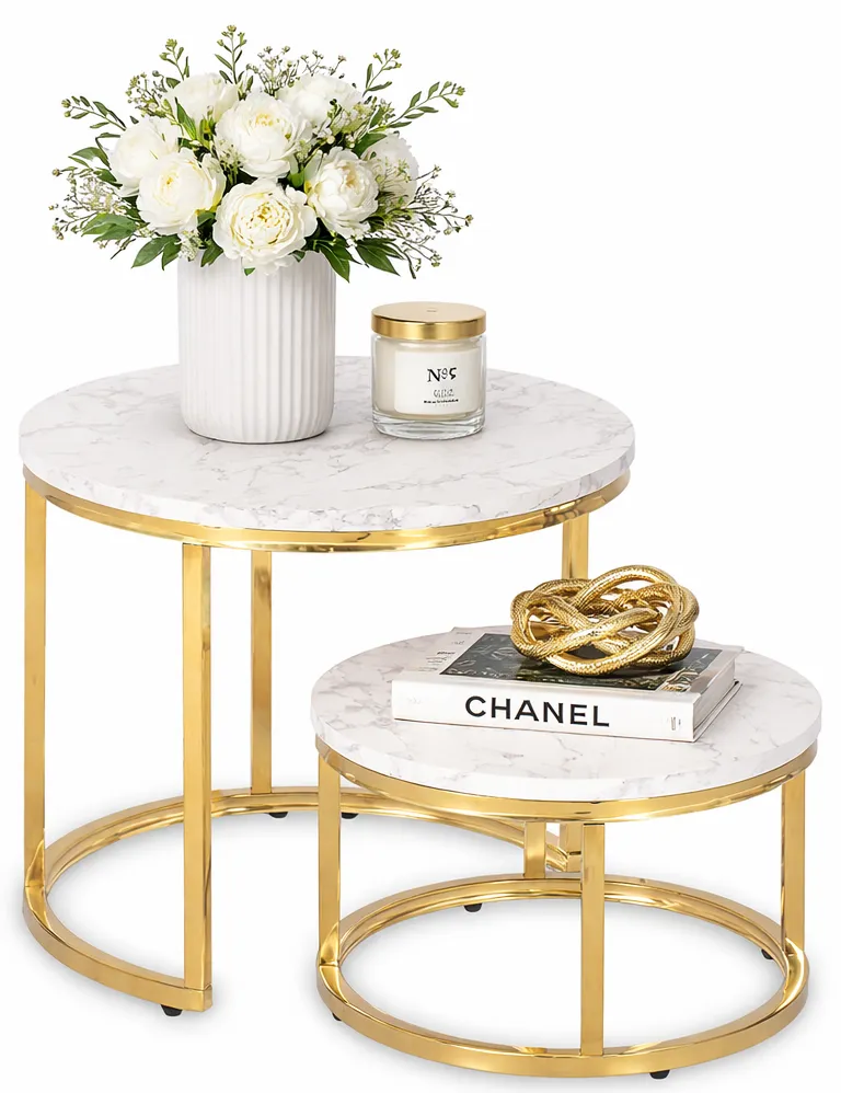 • okrągłe blaty imitujące marmur w połączeniu ze złotą podstawą dają spektakularny efekt, stając się sercem każdego salonu