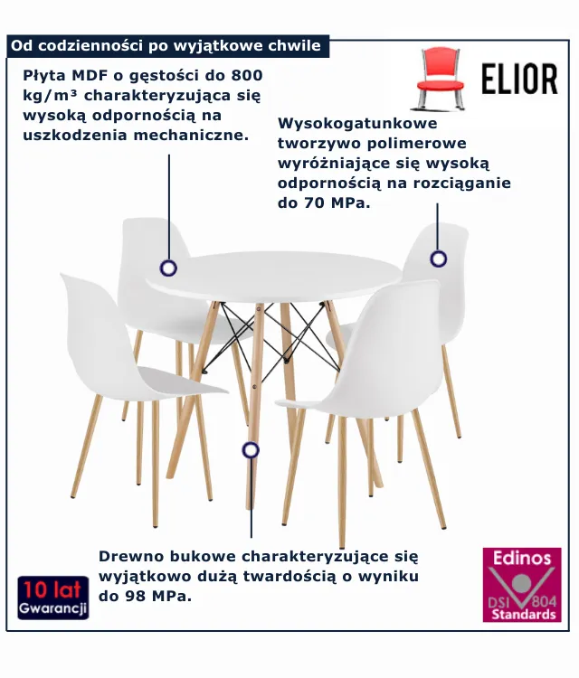 Wyobraź sobie sobotni poranek. Do kuchni wpada zapach świeżo zaparzonej kawy, na stole leży jeszcze ciepłe pieczywo, a wokół zbiera się rodzina, by wspólnie zacząć dzień. Albo późny wieczór – przy blasku świec i kieliszku wina rozmawiacie o minionym dniu, a stół staje się centrum spotkania i wymiany emocji. To właśnie takie momenty budują wspomnienia, które zostają na lata. Aby codzienność miała wyjątkową oprawę, potrzebny jest mebel, który nie tylko ułatwia życie, ale też nadaje mu stylowego charakteru. Zestaw stół z krzesłami Duto 4X marki Edinos Premium został stworzony dla tych, którzy cenią harmonię, elegancję i funkcjonalność w jednym.