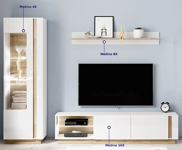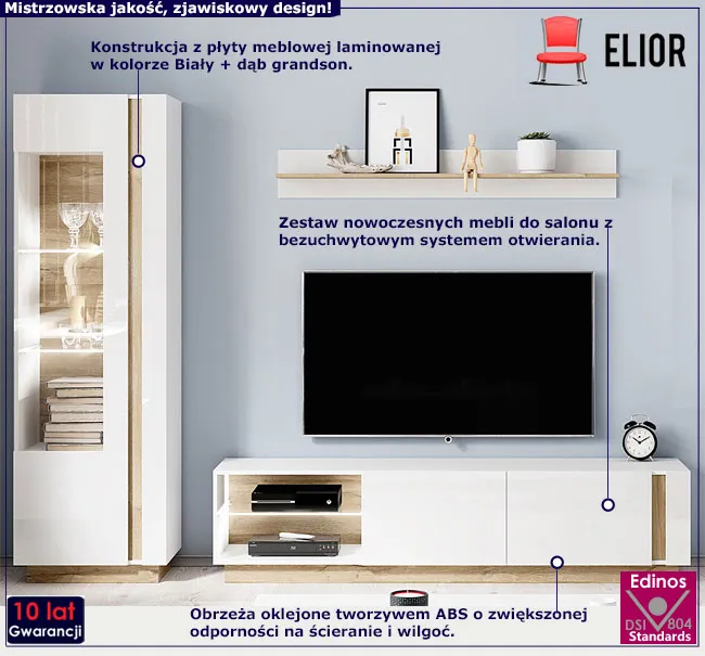 • Modny kolor: korpus: Biały mat, fronty: Biały połysk + dąb grandson. Szukasz stylowego zestawu do salonu? Kliknij w link i sprawdź zestawy do salonu w sklepie Edinos.pl. Stwórz własny praktyczny zestaw. Zamawiając produkty razem, oszczędzasz na współnej wysyłce.