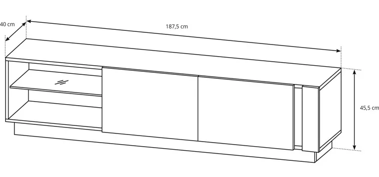 • Szafka rtv: wysokość: 45,5 cm, szerokość: 187,5 cm, głębokość: 40 cm.
