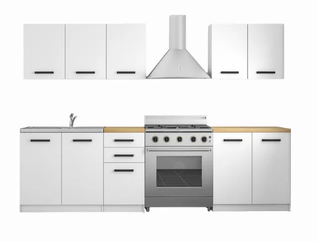 W zestawie kuchennym Igaris nie zabraknie powierzchni niezbędnych do swobodnego użytkowania kuchni. Segment dolny składa się ze stojącej szafki dwudrzwiowej, którą możesz wykorzystać na przechowywanie sprzętów gospodarstwa domowego, stojącej szafki dwudrzwiowej pod zlewozmywak, oraz stojącej pojedynczej szafki z szufladami, w której przechowasz sztućce, zioła i przyprawy lub inne mniejsze gabarytowo przyrządy kuchenne. Całość wykończona jest estetyczną maskującą listwą przypodłogową, ułatwiającą zachowanie czystości pod meblami. Panel górny stanowią dwie dwudrzwiowe szafki wiszące oraz jedna jedno-drzwiowa, idealna do przechowywania m.in. kawy i herbaty. Wszystkie szafki oprócz przeznaczonej pod zlewozmywak posiadają solidny blat w kolorze dąb artisan. Dzięki takiemu rozwiązaniu stojące elementy zestawu Igaris ustawisz w dowolnej konfiguracji i w dowolnym miejscu swojej kuchni.