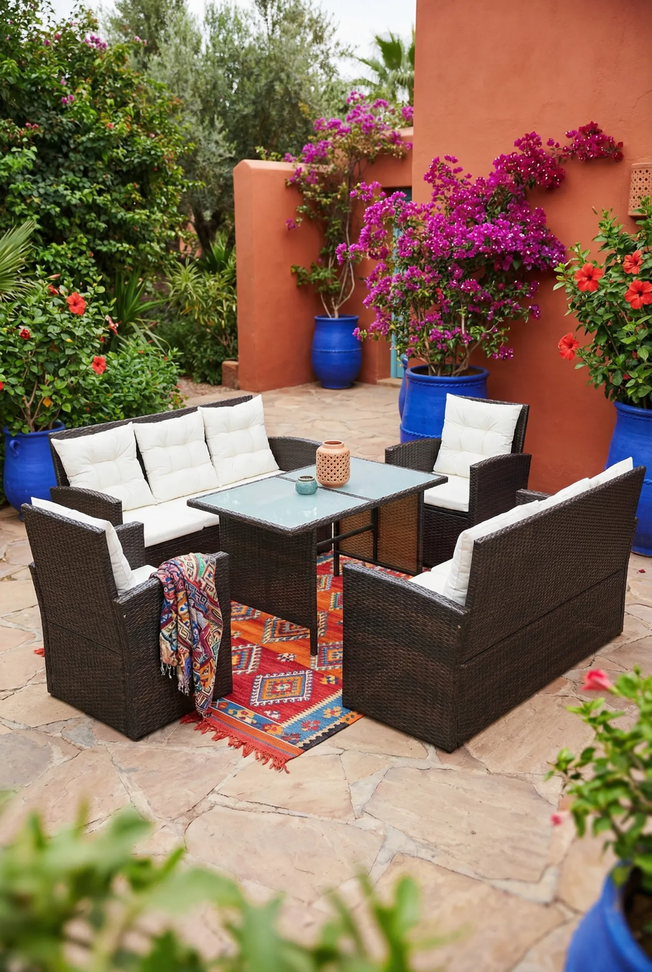- Materiał: rama z antykorozyjnej stali, odporny na wpływ czynników atmosferycznych polirattan, blat z nierysującego się szkła, poliestrowe poszewki.