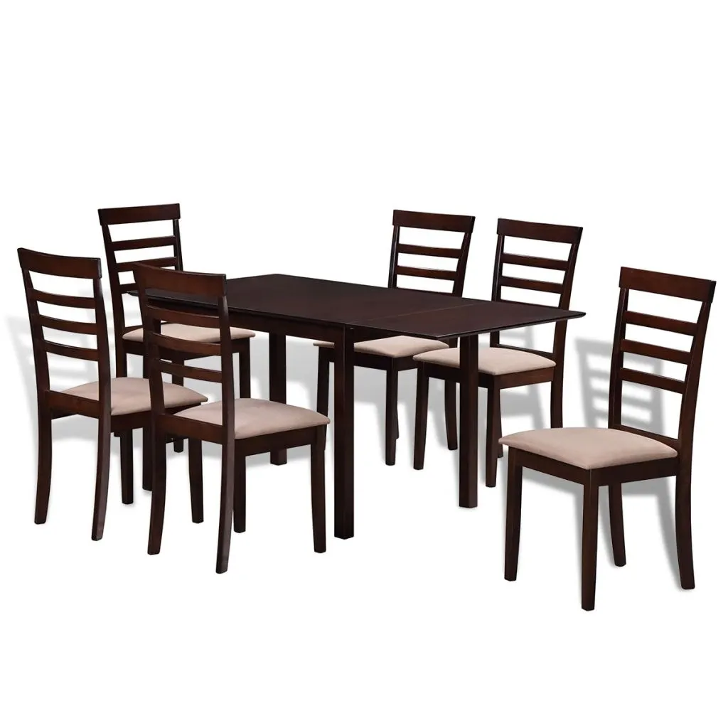 Nowoczesny, prosty zestaw z drewna, w skład którego wchodzi stół i 6 krzeseł, to produkt dla osób szukających połączenia stylu i funkcjonalności we wnętrzu swojego domu. Stół ten jest świetnym rozwiązaniem do mniejszych kuchni i zakątków do jedzenia. Rozkłada się on z jednej strony, gdy potrzebna jest większa jego powierzchnia i może być złożony, gdy nie ma takiej potrzeby. Blat wykonany jest z gładkiej, pomalowanej płyty MDF, łatwej do czyszczenia. Nogi z drewna kauczukowca są stabilne i mocne. Krzesła są obite gładką, miękką w dotyku tkaniną, a ich ergonomiczna forma zwiększa komfort siedzenia. W skład przesyłki wchodzi 1 stół i 6 krzeseł.