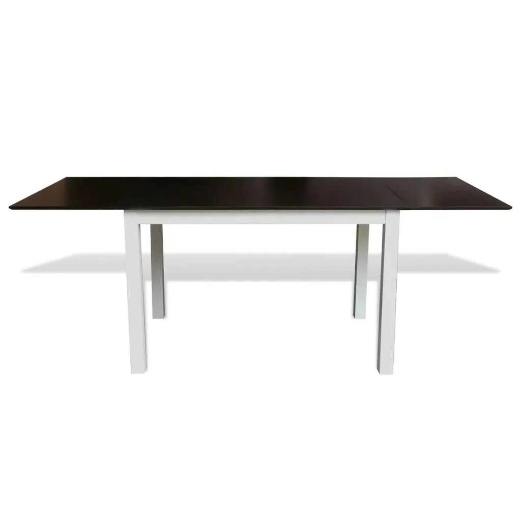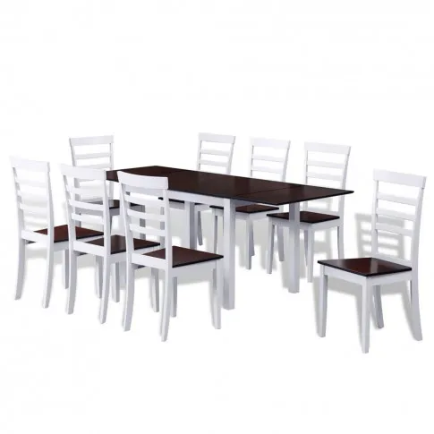 Nowoczesny, prosty zestaw z drewna, w skład którego wchodzi stół i 8 krzeseł, to produkt dla osób szukających połączenia stylu i funkcjonalności we wnętrzu swojego domu. Stół ten jest świetnym rozwiązaniem do mniejszych kuchni i zakątków do jedzenia. Rozkłada się on z dwóch stron, gdy potrzebna jest większa jego powierzchnia i może być złożony, gdy nie ma takiej potrzeby. Blat wykonany jest z gładkiej, pomalowanej płyty MDF, łatwej do czyszczenia. Nogi z drewna kauczukowca są stabilne i mocne. Ergonomiczna forma krzeseł nadaje komfortu. W skład przesyłki wchodzi 1stół i 8 krzeseł