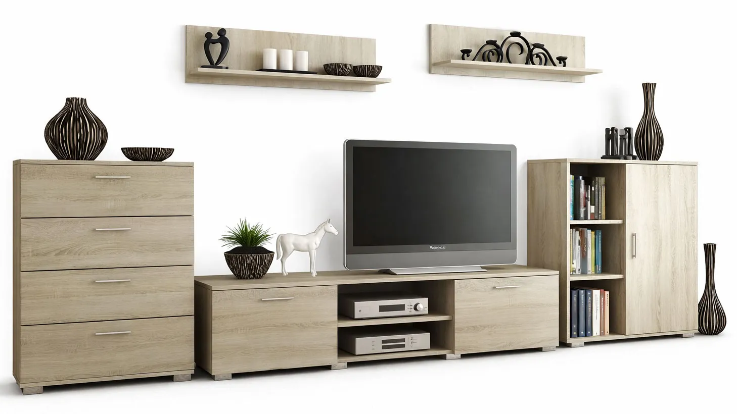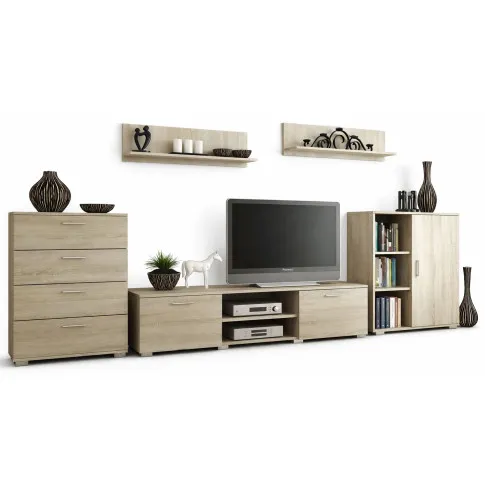 W mieszkaniu liczy się nie tylko wyjątkowa prezencja mebli, ale przede wszystkim ich funkcjonalne wykonanie i trwałość. Na szczęście znakomita meblościanka Hreida została wykonana z wysokogatunkowego surowca, który charakteryzuje się odpornością na rysy i uszkodzenia mechaniczne. Jest to profesjonalna, laminowana płyta meblowa o klasie higieny E1, uszlachetniona cienkimi filmami melaminowymi. Posiada ona także specjalne włókna ułożone różnokierunkowo o strukturze sinusoidalnej, co zapewnia nadanie jej cech jakościowych oraz wytrzymałościowych. Praktycznie skonstruowane szuflady oraz intuicyjnie otwierane półki to pewność wygodnego i przede wszystkim bezpiecznego użytkowania mebli. Ponadto modne fronty szafek podkreślają nowoczesny i modernistyczny styl mebla. Cztery głębokie, praktyczne szuflady komody to idealne miejsce do przechowywania wielu rzeczy w estetyczny, schludny i wygodny sposób. Dziecięce zabawki, ręczniki i pościel, bielizna a może ubrania? Szuflady komody Hreida zapewnią Ci odpowiednie miejsce na Twoje przedmioty. Szafki stojące to z kolei doskonałe miejsca na książki i dokumenty. Szafka RTV odpowiednio zadba o Twój sprzęt elektroniczny. Z kolei półka wisząca wyjątkowo ozdobi Twoją ścianę, szczególnie gdy umieścisz tam efektowne dekoracje.
