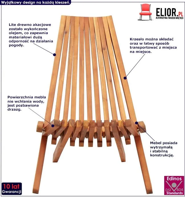 Do produkcji krzeseł Nolim 3X zastosowano najwyższej jakości surowiec, które został pozyskany w sposób ekologiczny. Lite drewno akacjowe posiada dużą odporność na nacisk, ponadto świetnie radzi sobie z trudnymi warunkami atmosferycznymi. Materiał nie wchłania również wilgoci, ani nie wypiętrza się. Nolim 3X możesz zatem używać wszędzie: na balkonie, przy ognisku lub obok basenu. Jesteś fanem wyjazdów poza miasto? Żaden problem! Ergonomiczny kształt oraz solidne wykonanie czynią z tych krzeseł idealny wybór na kempingi, jak też imprezy plenerowe. Od teraz nie będziesz musiał zachodzić w głowę o dodatkowe miejsce do siedzenia. Nolim 3X zapewni Ci wygodę w najlepszym wydaniu, a do tego produkt pozostaje niełamliwy oraz odporny na uszkodzenia nawet w problematycznych warunkach. Problem pleśni, gnicia czy wystających drzazg również stał się właśnie przeszłością. Drewno o naturalnych słojach zostało poddane precyzyjnemu olejowaniu oraz zabezpieczone przed działaniem czynników zewnętrznych.