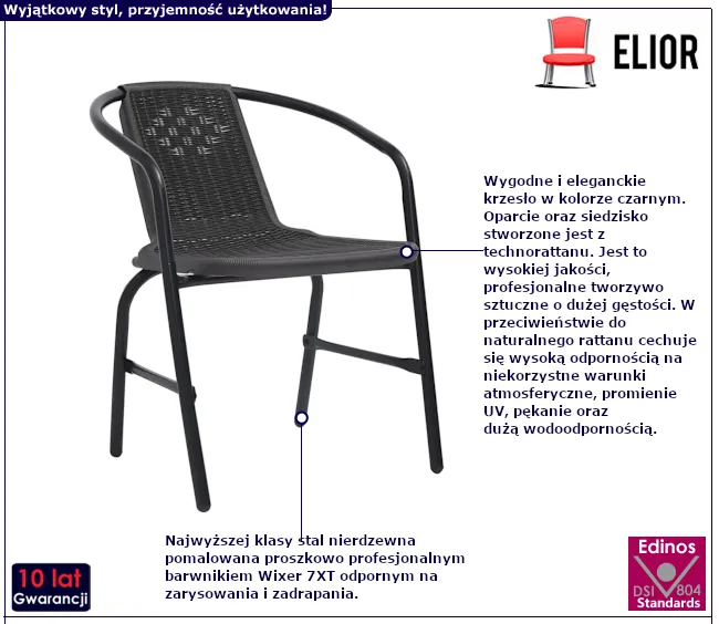 • Oparcie oraz siedzisko wykonane z Technorattanu. Jest to wysokiej jakości, profesjonalne tworzywo sztuczne o dużej gęstości. W przeciwieństwie do naturalnego rattanu cechuje się wysoką odpornością na niekorzystne warunki atmosferyczne, promienie UV, pękanie oraz dużą wodoodpornością. Jest lekki i łatwy do utrzymania w czystości, co jest szczególnie ważne w przypadku mebli ogrodowych. Technorattan jest ekologiczny i , można go poddawać recyklingowi.