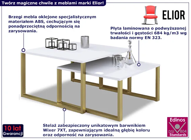 • Kolor: stelaż: złoty, blat: biały mat. Kliknij w link i sprawdź także inne małe stoliki kawowe w sklepie Edinos.pl. Stwórz swóją praktyczną przestrzeń.