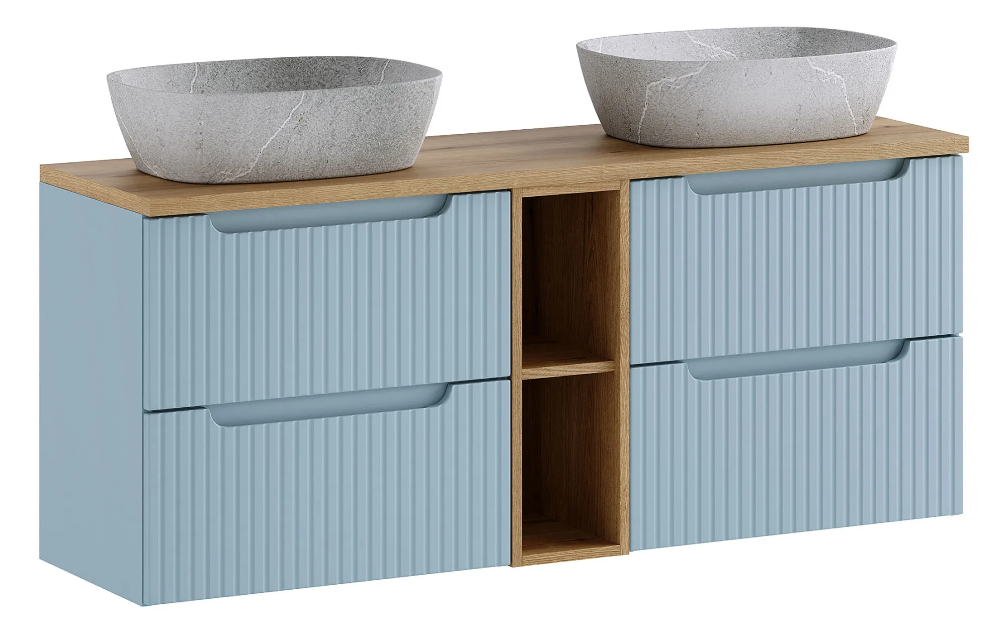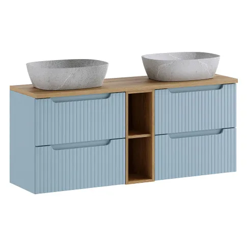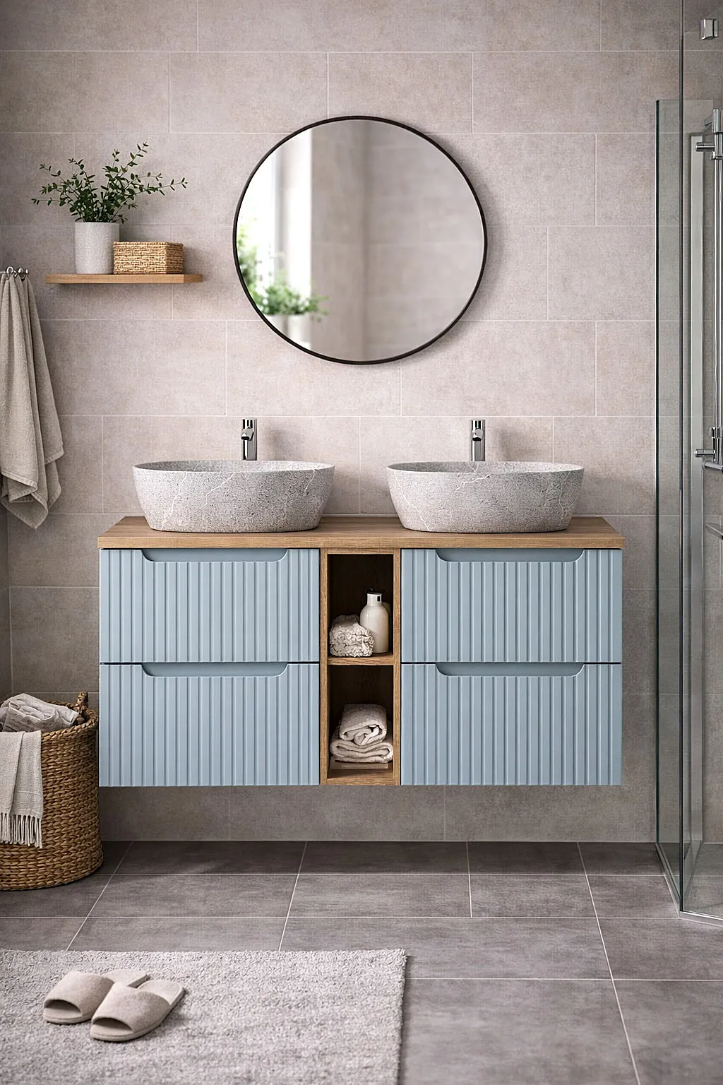 Zestaw łazienkowy z umywalkami Arvessi 11X marki Edinos Premium to kompletne i wyjątkowo funkcjonalne rozwiązanie stworzone z myślą o komfortowym użytkowaniu łazienki przez dwie osoby. Szeroka szafka z czterema pojemnymi szufladami oraz praktyczną, otwartą wnęką pozwala wygodnie uporządkować kosmetyki i akcesoria, a dwie dopasowane umywalki nablatowe zapewniają swobodę i wygodę podczas codziennych czynności. Pionowe ryflowania frontów w połączeniu z blatem w dekorze drewna tworzą elegancką, nowoczesną kompozycję, która nadaje wnętrzu harmonijny i dopracowany charakter.
