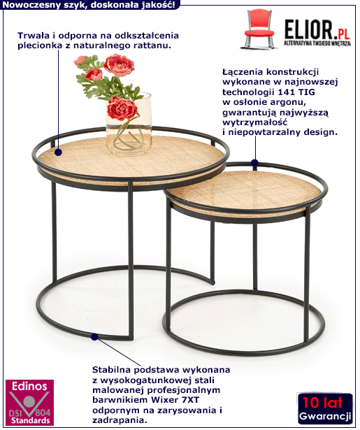Zestaw Keby poza walorami estetycznymi posiada mnóstwo cech jakościowych. Precyzyjne wykonanie oraz wysokogatunkowe materiały zapewniają nam długoletnie korzystanie z mebli bez ich uszkodzeń. Marka Edinos Premium wychodząc na przeciw oczekiwaniom klientów zadbała o każdy najmniejszy szczegół, aby meble spełniały absolutnie wszystkie oczekiwania. Blat mebla wykonany został z odpornego na uszkodzenia mechaniczne, a przy tym wyjątkowo plastycznego rattanu. Rattan to naturalny materiał, uważany za najlepszy do produkcji mebli plecionych. Jest pozyskiwany z winorośli palmowej - Ratangu, rosnącej w strefie tropikalnej. Rattan jest najtrwalszym materiałem służącym do produkcji mebli wyplatanych, ponieważ jego słoje rosną pionowo a nie poziomo, co powoduje, że są praktycznie niemożliwe do złamania, a przy tym bardzo plastyczne. Istotną cechą jest to, że raz wypleciony i odpowiednio wysuszony wzór z rattanu nie jest podatny na odkształcanie się. Naturalny rattan posiada właściwości antyalergiczne i antystatyczne, co jest szczególnie ważne dla dzieci oraz osób uczulonych na kurz i roztocza. Rattan można czyścić na mokro, co pozwala zachować czystość i higienę, a także estetyczny wygląd mebla. Konstrukcja stolików wykonana została z najwyższej jakości stali nierdzewnej pomalowanej proszkowo odpornym na zarysowania i zadrapania. Najwyższa jakość techniki metody natrysku proszkowego pozwoliła zaoferować marce Edinos Premium aż 10 lat gwar. na swoje produkty. Technika malowania proszkowego charakteryzuje się dużą trwałością, odpornością na korozję, chemikalia, wysoką temperaturę oraz uszkodzenia mechaniczne, dzięki czemu znacznie podnosi walory użytkowe i estetyczne mebla. Keby bez wątpienia zaskoczy Cię pod każdym względem, stając się nieodłącznym elementem Twojego wnętrza!