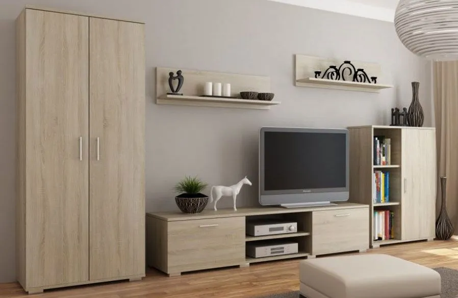 - Zestaw składa się z: 1 szt. szafka RTV, (wysokość: 35 cm, długość: 150 cm, głębokość: 40 cm), 2 szt. półka wisząca, (wysokość: 20 cm, długość: 100 cm, głębokość: 20 cm), 1 szt. komoda stojąca (wysokość: 100 cm, szerokość: 80 cm, głębokość: 30 cm), 1 szt. szafa stojąca, (wysokość: 190 cm, szerokość: 80 cm, głębokość: 50 cm. Zawiera drążek na ubrania oraz półkę nad nim). Istnieje możliwość dokupienia pojedynczych elementów zestawu. Aby przejść do konkretnych ofert, kliknij w powyższe linki.