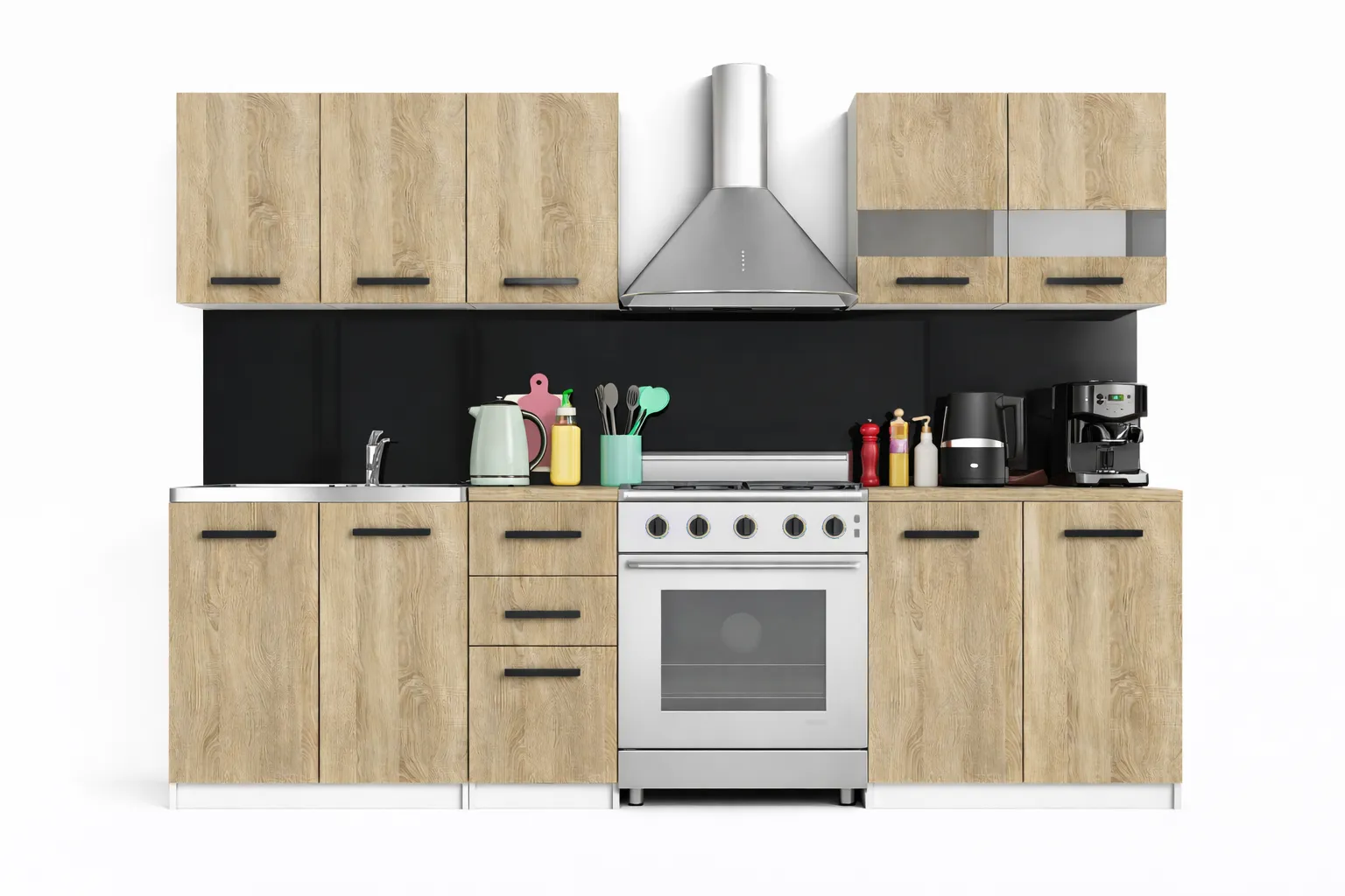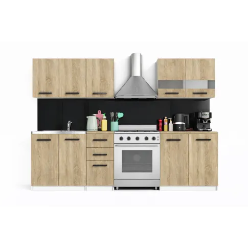 W zestawie kuchennym Igaris nie zabraknie powierzchni niezbędnych do swobodnego użytkowania kuchni. Segment dolny składa się ze stojącej szafki dwudrzwiowej, którą możesz wykorzystać na przechowywanie sprzętów gospodarstwa domowego, stojącej szafki dwudrzwiowej pod zlewozmywak, oraz stojącej pojedynczej szafki z szufladami, w której przechowasz sztućce, zioła i przyprawy lub inne mniejsze gabarytowo przyrządy kuchenne. Całość wykończona jest estetyczną maskującą listwą przypodłogową, ułatwiającą zachowanie czystości pod meblami. Panel górny stanowią dwie dwudrzwiowe szafki wiszące ( w tym jedna to szafka witrynowa ) oraz jedna jedno-drzwiowa, idealna do przechowywania m.in. kawy i herbaty. Wszystkie szafki oprócz przeznaczonej pod zlewozmywak posiadają solidny blat w kolorze dąb sonoma. Dzięki takiemu rozwiązaniu stojące elementy zestawu Igaris ustawisz w dowolnej konfiguracji i w dowolnym miejscu swojej kuchni.