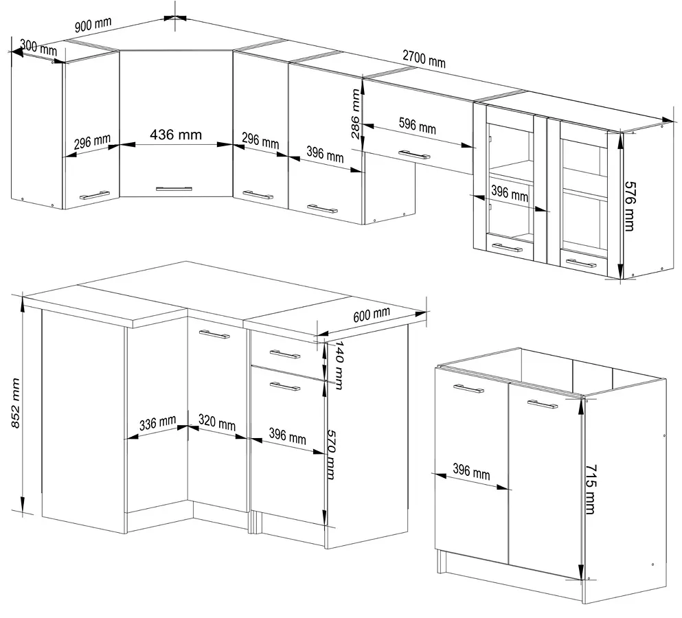 • Gotowy zestaw - sześć szafek górne w tym jedna przystosowana do zamontowania okapu oraz trzy szafki dolne - dwie z blatem, a trzecia pod zlew