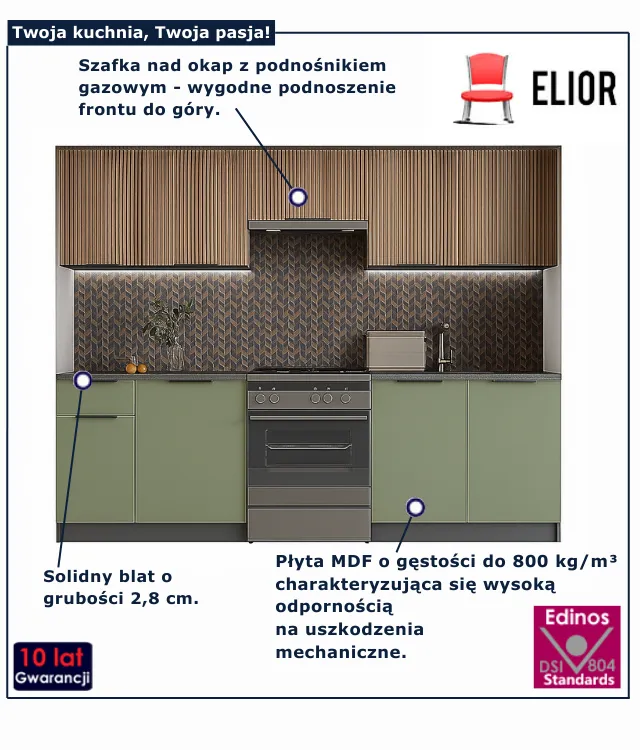 Zamieniając swoją kuchnię w miejsce, w którym piękno łączy się z użytecznością, tworzysz centrum domu idealne do przyjmowania gości lub wypoczynku w gronie najbliższych. Zestaw kuchenny Pure marki Edinos Premium, o długości 240 cm, jest dostępny za atrakcyjną cenę 2338 zł. Nie czekaj i już dziś zadbaj o swój wymarzony kącik!