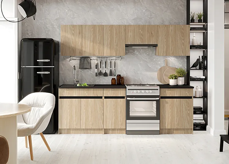 Komplet mebli kuchennych Semina łączy w sobie najnowsze trendy w dziedzinie designu z praktycznymi rozwiązaniami. Szafki z obniżonymi frontami, które zastępują klasyczne uchwyty są nie tylko estetyczne, ale również niezwykle funkcjonalne. Dzięki temu otwieranie i zamykanie drzwiczek staje się łatwiejsze niż kiedykolwiek. Szafka okapowa z systemem TIP ON to kolejna nowatorska funkcja, która ułatwi Ci życie. Wybarwienie frontów w dekorze Dąb Olejowany zmiksowane z elagancką czernią blatu wprowadza do wnętrza nowoczesny, a zarazem przytulny klimat. Ten dynamiczny design zestawiony z praktycznym wymiarem szafek to duet, który z pewnością zachwyci nie tylko Ciebie, ale również Twoich gości.