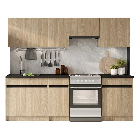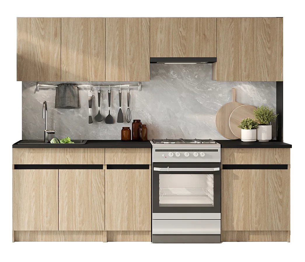 • Wymiary całkowite: wysokość szafek dolnych: 85 cm, głębokość szafek dolnych: 60 cm, wysokość szafek górnych: 56 cm, głębokość szafek górnych: 28,8 cm, szerokość całkowita zestawu: 240 cm.