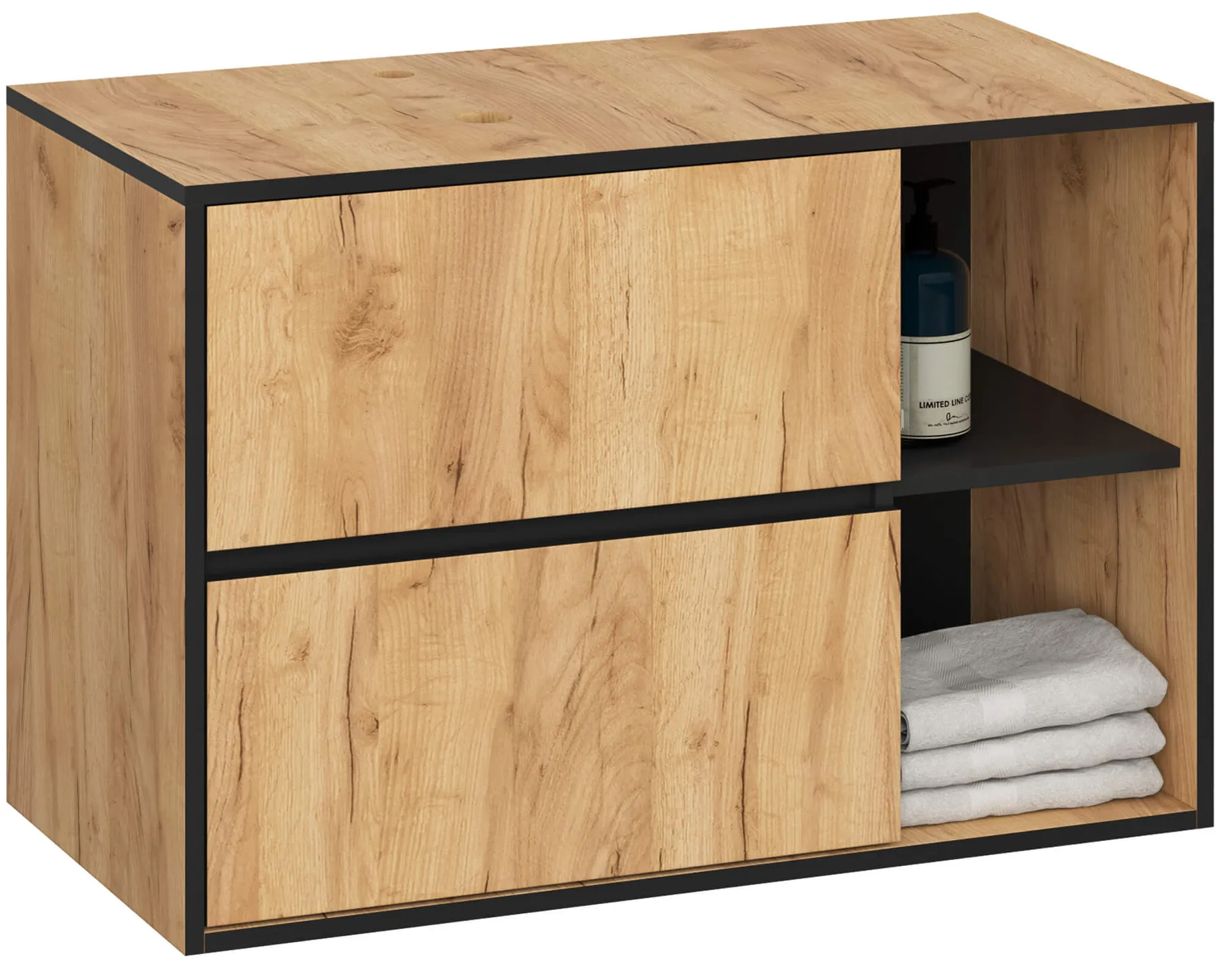 • Szafka pod umywalkę z otworami montażowymi – gwarantuje estetyczne i bezproblemowe dopasowanie do ceramiki, zachowując nowoczesny wygląd.
