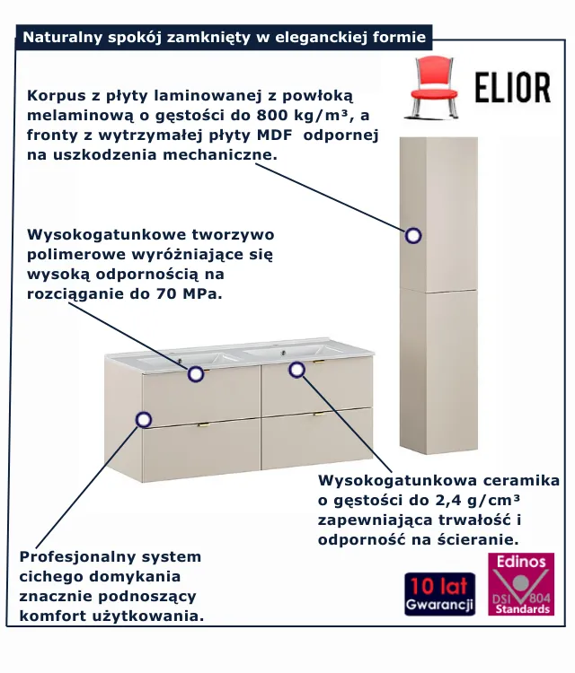 • Produkt posiada certyfikat jakości "Edinos Standards DSI 804", który potwierdza najwyższą jakość wykonania mebla oraz pełny stopień zgodności poszczególnych jednostek wytworzonego wyrobu z przyjętym wzorcem.