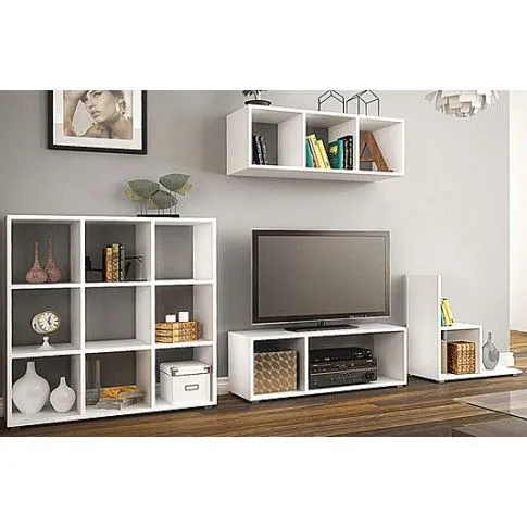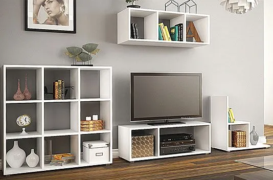 - Zawartość zestawu oraz wymiary mebli: półka wisząca Maleo 3R (wysokość: 33 cm, szerokość: 105 cm, głębokość: 33 cm), regał kwadrat Maleo 6X (wysokość: 107 cm, szerokość: 105 cm, głębokość: 33 cm), szafka RTV Maleo 7X (wysokość: 33 cm, szerokość: 105 cm, głębokość: 33 cm), mniejszy regał Maleo 4R (wysokość: 66 cm, szerokość: 64 cm, głębokość: 33 cm). Po kliknięciu w powyższe linki, zostaniesz przeniesiony do ofert z konkretnymi elementami zestawu.
