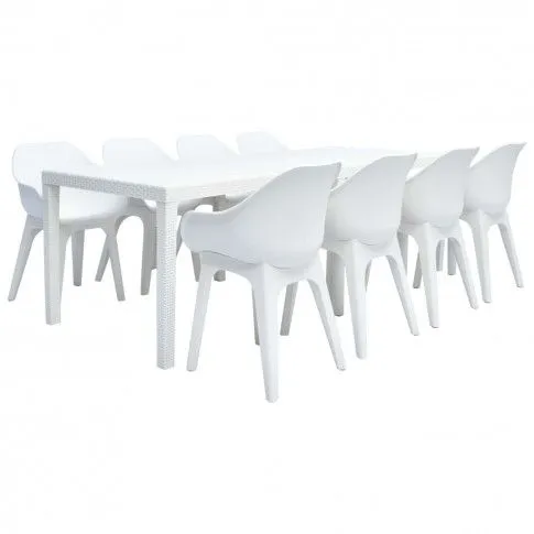 Ten komplet będzie znakomitym uzupełnieniem dla Twojego ogrodu, choć bez problemu możesz go również wziąć ze sobą na wycieczkę. Wadin 5X to zestaw składający się z szerokiego stołu o prostokątnym blacie oraz ośmiu krzeseł. Biały kolor rozjaśni Twoją przestrzeń i sprawdzi się w szerokim wachlarzu aranżacji. Nie ograniczaj się więc – uniwersalny szyk zestawu Wadin 5X pozwoli Ci eksperymentować z nowoczesnym koncepcjami, na które Twój ogród tylko czeka! Rodzinny wieczór na werandzie, odpoczynek w cieniu drzew, a może lektura ulubionej książki wśród zieleni? Wadin 5X jest jedynym w swoim rodzaju rozwiązaniem Twoich potrzeb!