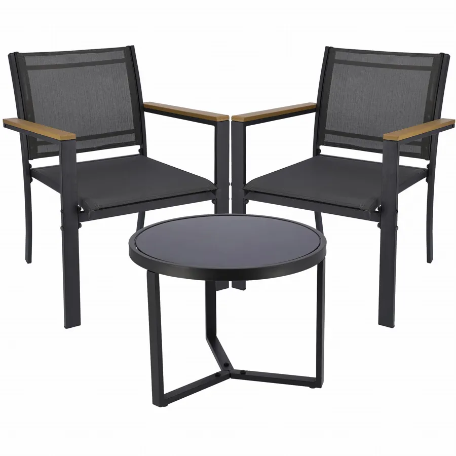 • Nowoczesny design: elegancki wygląd zestawu, składającego się z dwóch foteli i okrągłego stolika ze szklanym blatem, idealnie komponuje się z każdym otoczeniem, tworząc stylową przestrzeń na zewnątrz.