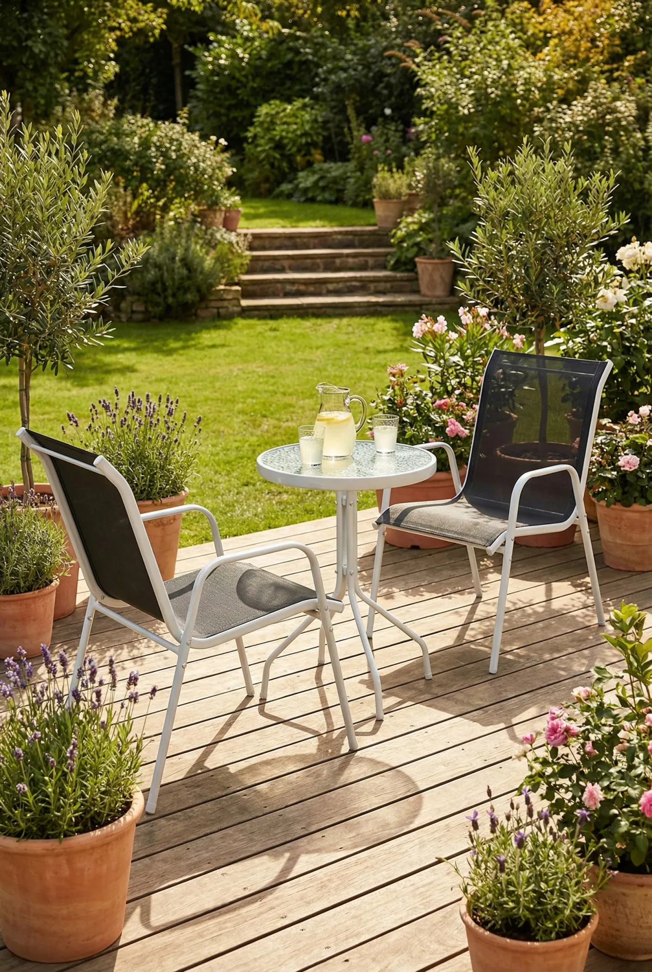 Zestaw Tirena 3X możesz umieścić w dowolnym miejscu zewnętrznej przestrzeni. Krzesła oraz stolik są bowiem łatwe do przestawiania, więc będziesz mógł się raczyć kawą bądź deserem nawet bezpośrednio na trawniku przed swoim domem. Poniżej podajemy przykłady kilku lokalizacji, w których ten zestaw doskonale się odnajdzie: