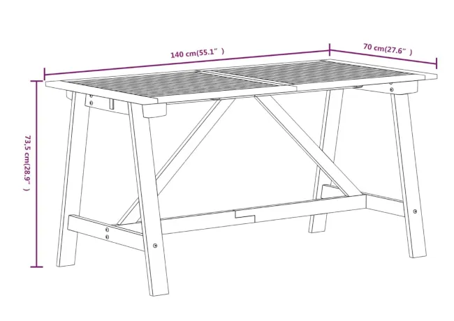 • Wymiary stołu: szerokość: 70 cm, wysokość: 73,5 cm, długość: 140 cm.