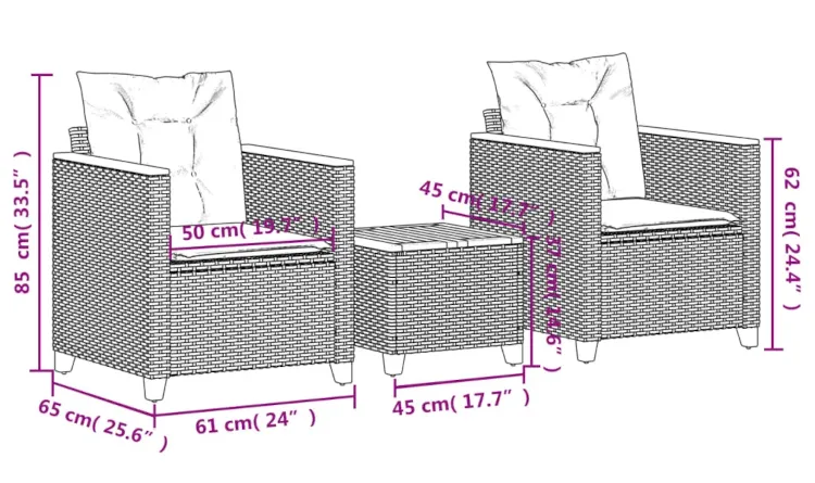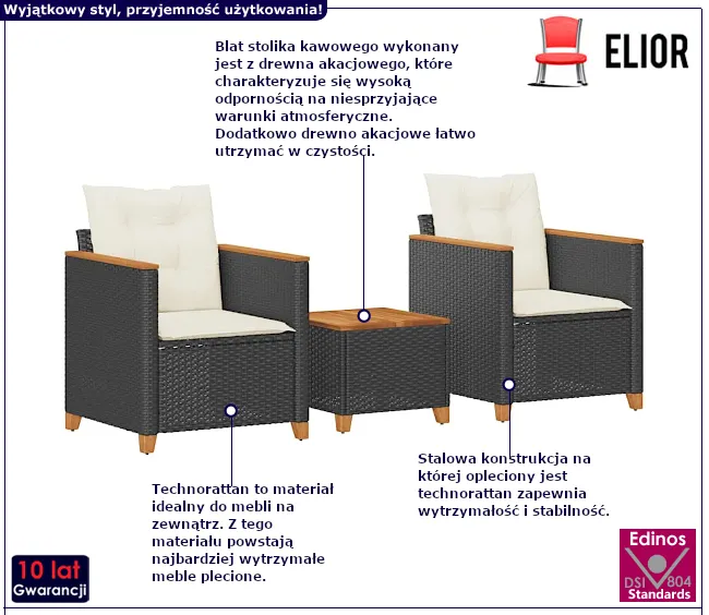 • Zestaw zawiera: stolik kawowy oraz dwa fotele z poduszkami.