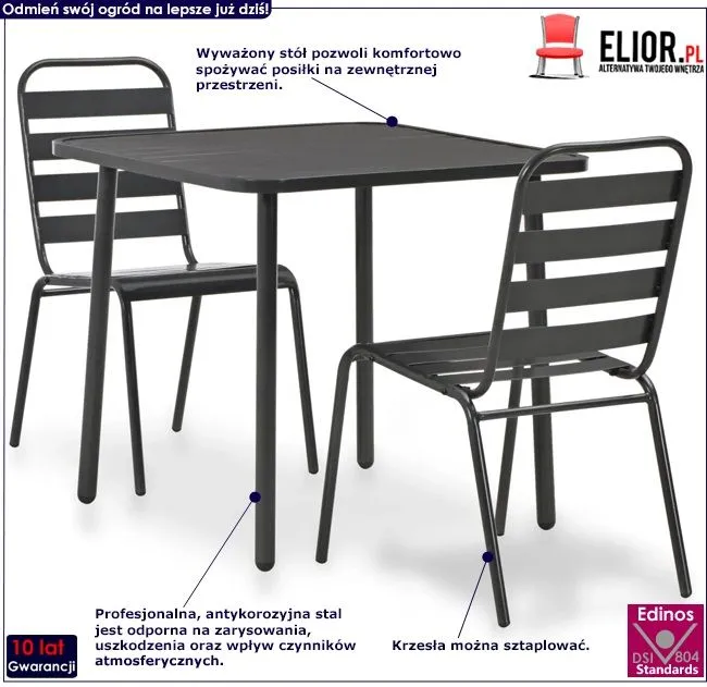 - Wymiary stołu: długość – 80 cm, szerokość – 80 cm, wysokość – 72 cm - Wymiary podstawowe krzesła: szerokość – 42 cm, głębokość – 63 cm, wysokość – 84 cm - Szerokość siedziska – 42 cm - Głębokość siedziska – 34,5 cm - Wysokość siedziska nad ziemią – 42 cm - Materiał: odporna na korozję stal. - Kolor: szary. Kliknij w link i sprawdź także inne zestawy ogrodowe w sklepie Edinos.pl. Stwórz swój praktyczny zestaw mebli. - Produkt posiada certyfikat jakości "Edinos Standards DSI 804", który potwierdza najwyższą jakość wykonania mebla oraz pełny stopień zgodności poszczególnych jednostek wytworzonego wyrobu z przyjętym wzorcem. - Bardzo łatwy montaż (w zestawie znajduje się czytelna i dokładna instrukcja montażu mebla). - Gwarancja 10 lat (inni producenci oferują maksymalnie 24 miesiące gwarancji. Tylko u nas otrzymujesz pełną jakość potwierdzoną aż 10-letnią gwarancją)!