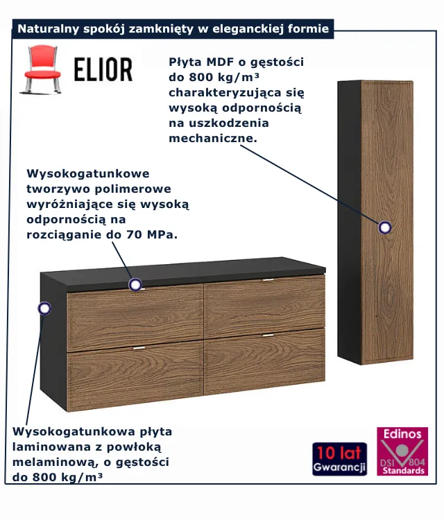 • Produkt posiada certyfikat jakości "Edinos Standards DSI 804", który potwierdza najwyższą jakość wykonania mebla oraz pełny stopień zgodności poszczególnych jednostek wytworzonego wyrobu z przyjętym wzorcem.